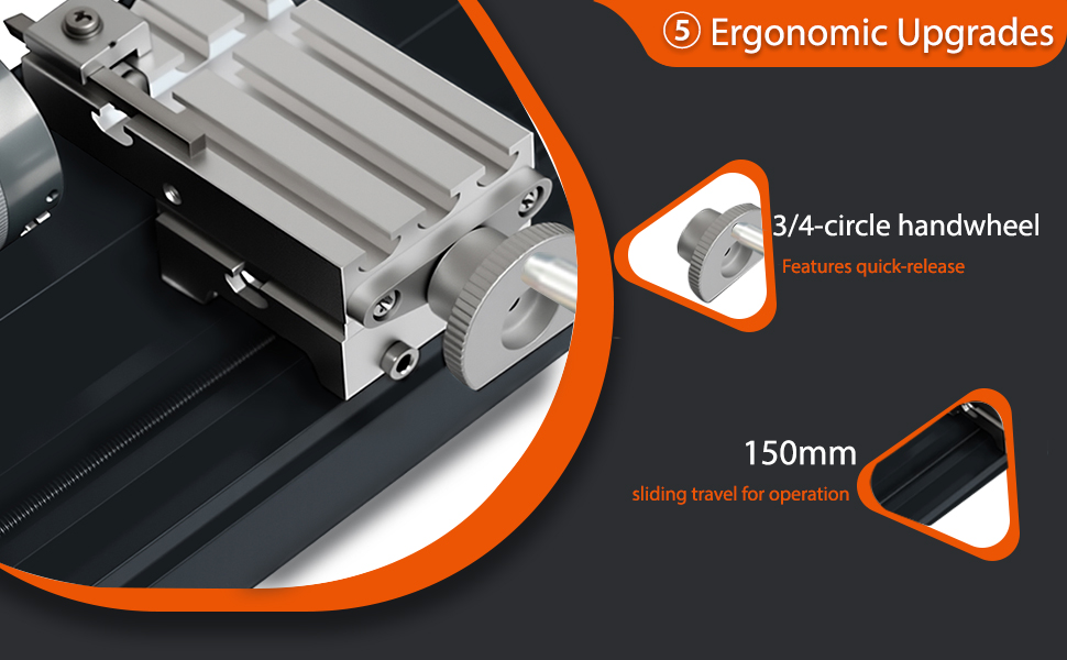 12.The whole hand wheel is made of super alloy material, which be assembled in X, Z axis and tailstock. Featuring with 0.02mm scale line, the hand wheel increases the precision when processing. (The scale lines are molded at one time, aren't sticky label)