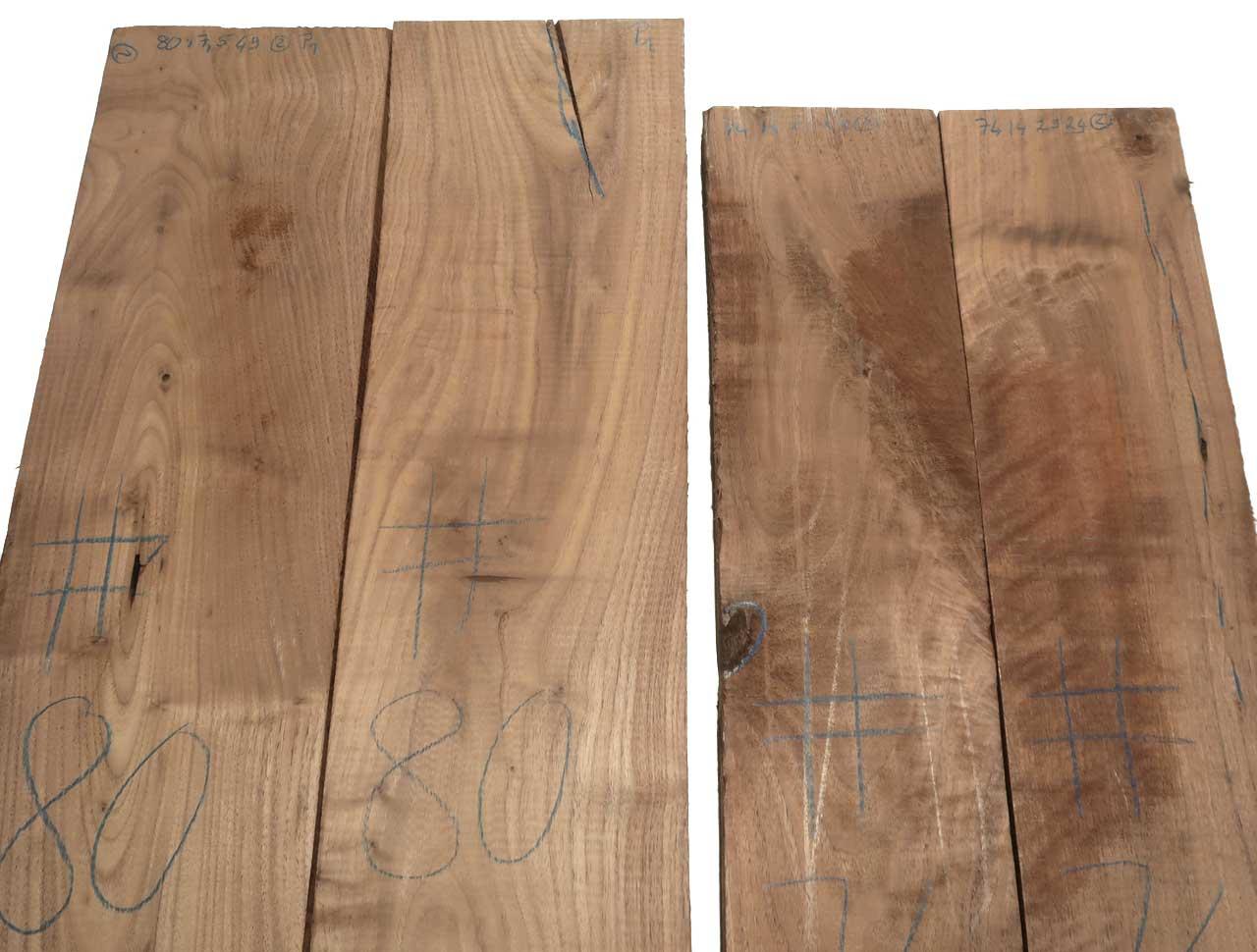 Das Nussbaum Holzbrett ist trocken, nur im Rohzuschnitt, geriegelt, beide Seiten leicht vorgehobelt (kann aber trotzdem noch teilweise etwas rauh sein - siehe dunklere Stellen auf den Fotos!), Es ist manchmal schwierig den/die Riegel/Flammung auf den Fotos festzuhalten! Teilweise rustikales Holz (bitte Fotos von beiden Seiten berücksichtigen), mögliche Merkmale wie feine Haarrisse, Einwüchse, Äste, Risse, Insektenlöcher... werden so gut wie möglich mit Farbe/Kreide gekennzeichnet, die Stärke kann hin und wieder mal +/- 1 mm abweichen! Die grauen/dunklen Flecken sind nur vom Lagern beim Trocknen entstanden und nur oberflächlich, lassen sich abschleifen!