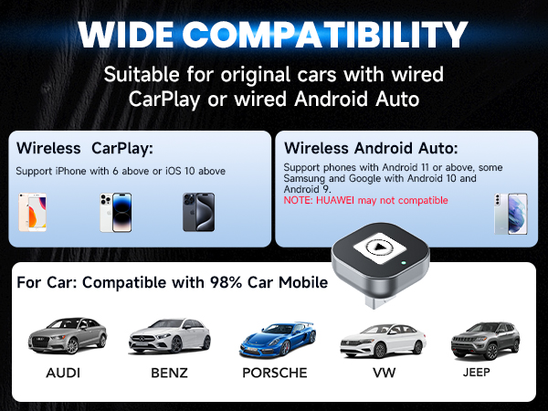 Wide Compatibility: Our adapter is compatible with more than 600 car models. Please make sure your car has a built-in factory-wired Apple CarPlay or wired Android Auto system for the adapter to work. Compatible with iPhone 6 above or iOS 10 above and Android 11 or later, some Samsung and Google compatible with Android 10 and Android 9
