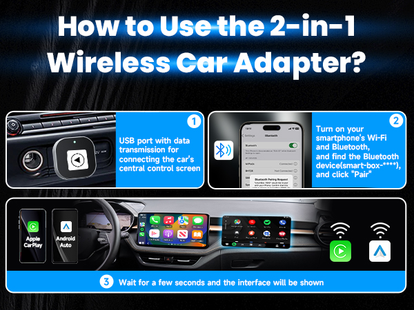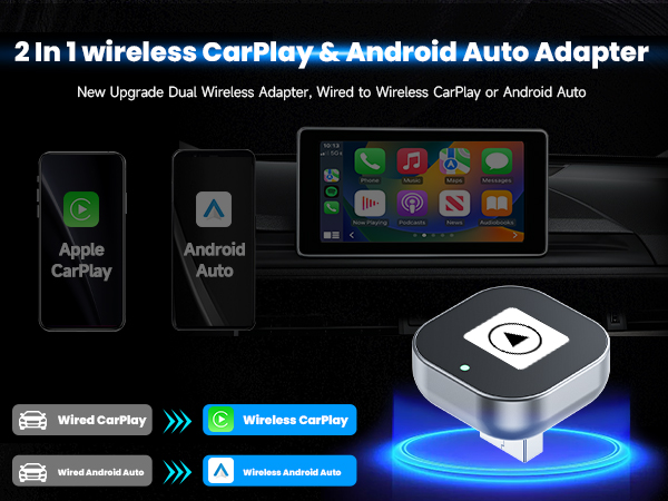 Please read before purchase: 1. This wireless car play and Android adapter is only suitable for cars with OEM factory wired car and Android Auto from 2017; 1. Please make sure your car has wired Apple CarPlay or wired Android Auto function; 3. Wi-Fi and Bluetooth must be turned on at the same time and not occupied by other devices