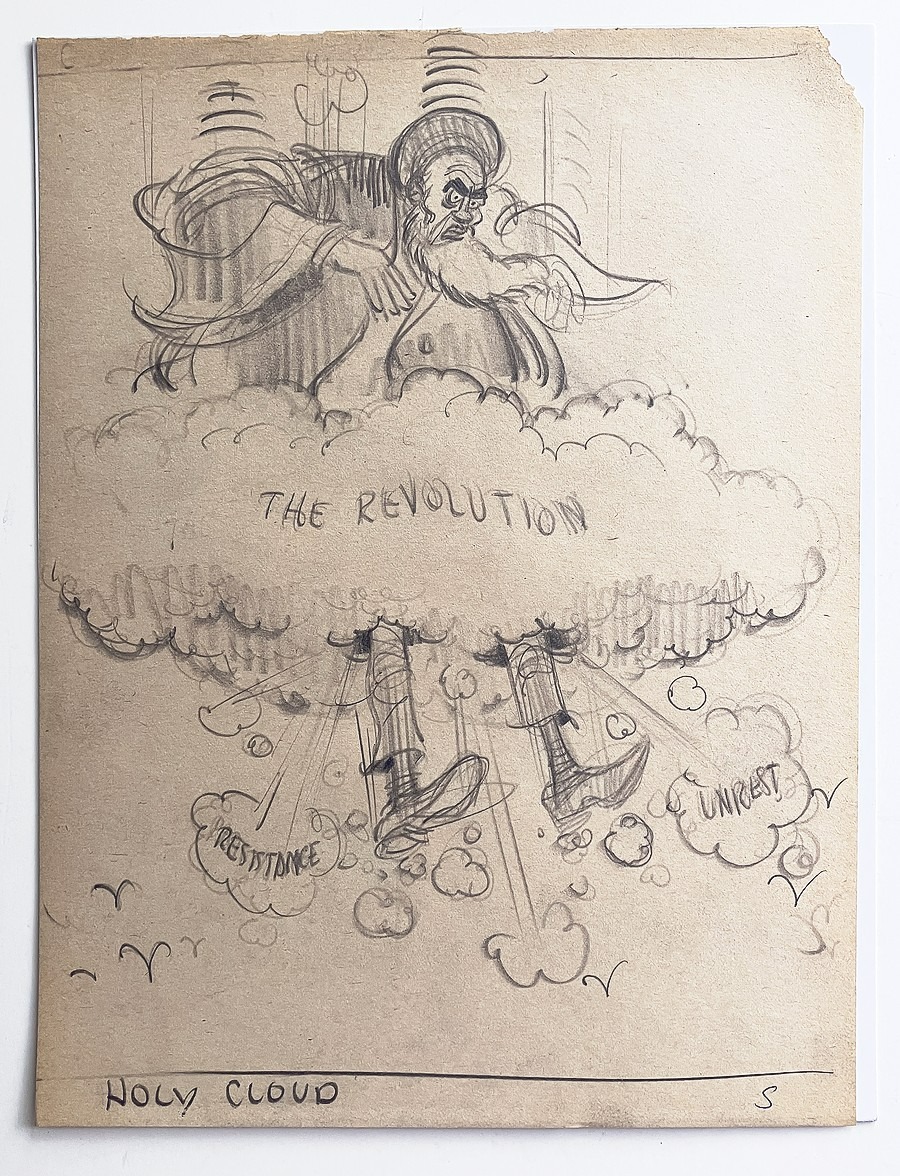 drawing on paper of the Ayatollah Khomeini in a "holy cloud" announcing the revolution in Iran in 1979, 9 by 12 inches,