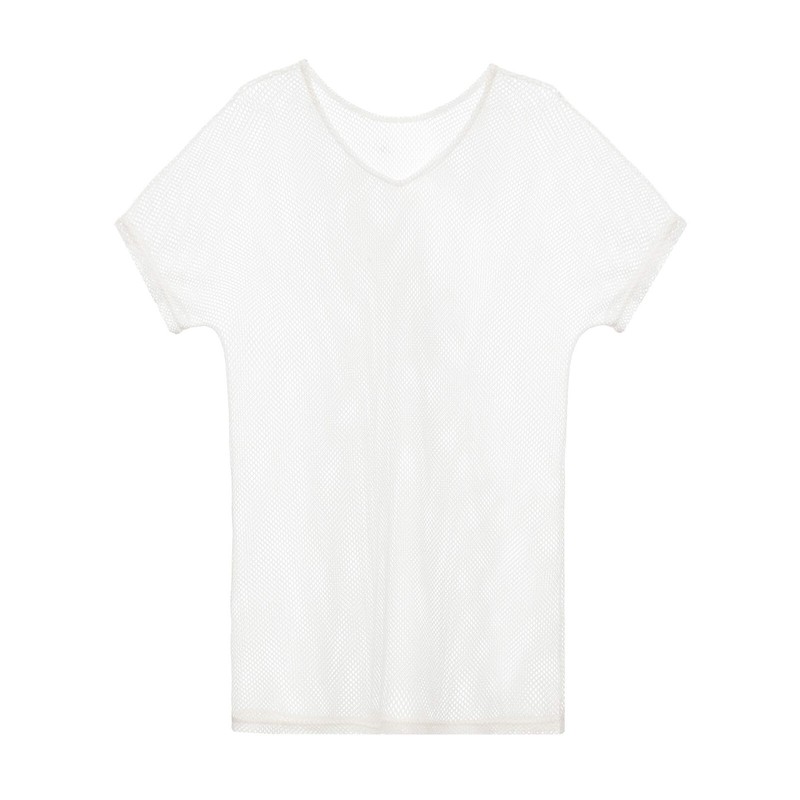 Designed with v neck, short sleeve, knee length, hollow out loose netting dress style.