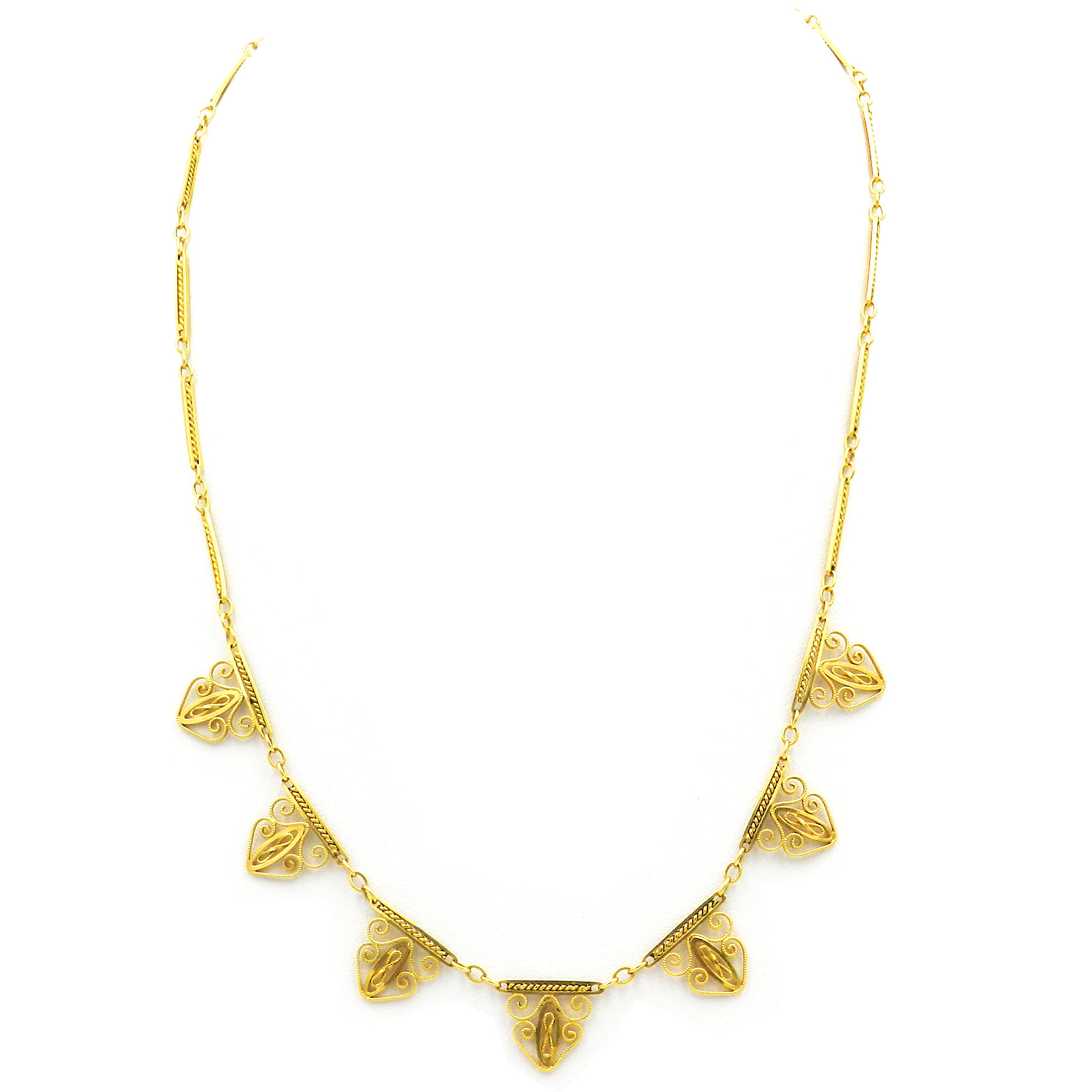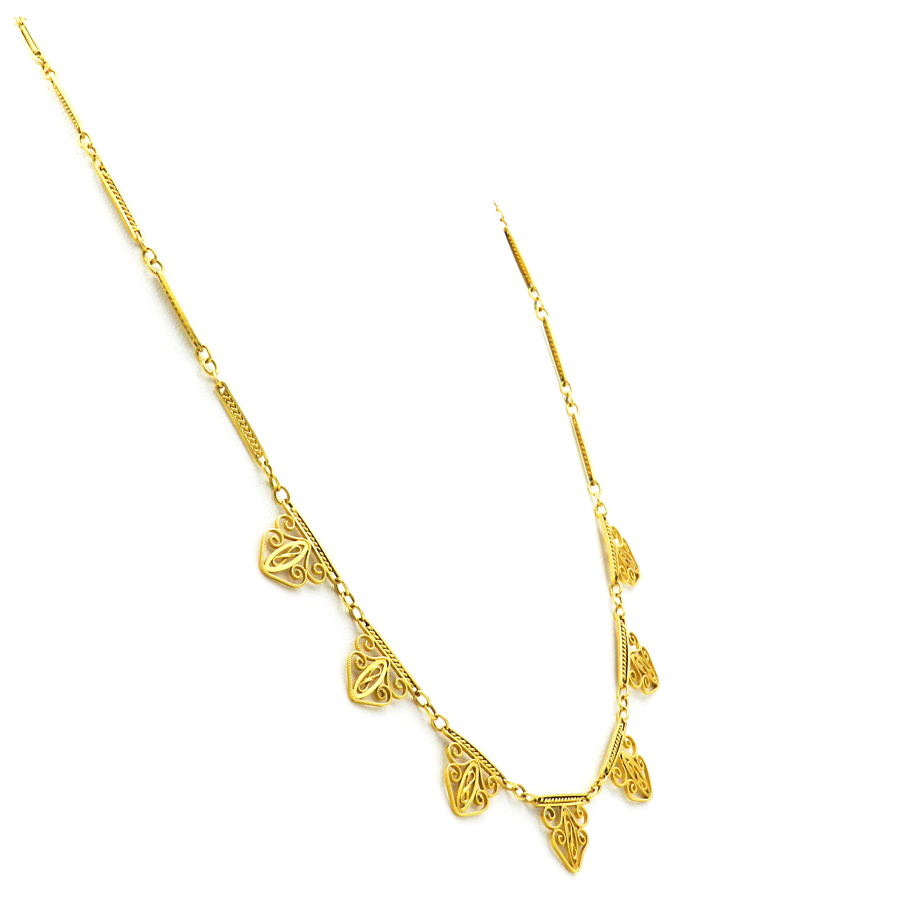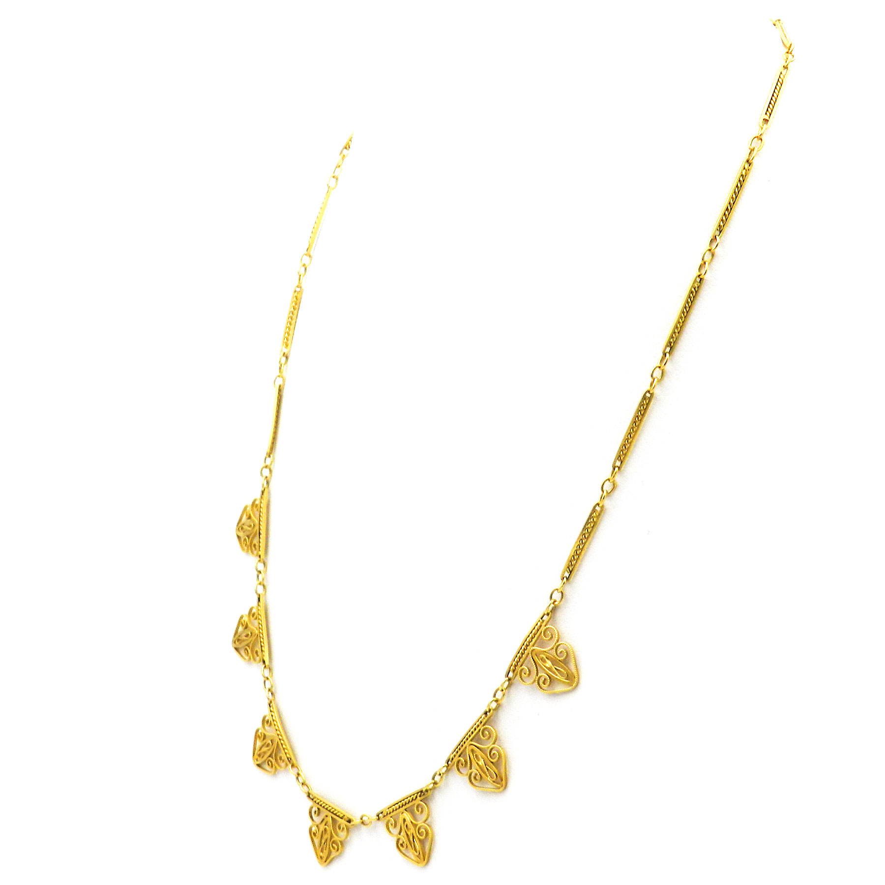 Filigranes Jugendstil Gold Collier sogen. Colliette aus 18K/750 Gold. Das dekorative Mittelteil bestehend aus filigran durchbrochenen Elementen, im Verlauf aneinander gereiht und in einer zarten stäbchenförmigen Kette endend. Der Verschluss mit Federring sorgt für sicheren Halt. Das historische Goldcollier entstand um 1910 in Paris. Mit einer Länge von 40 cm wird die zauberhafte Goldkette halsnah getragen.