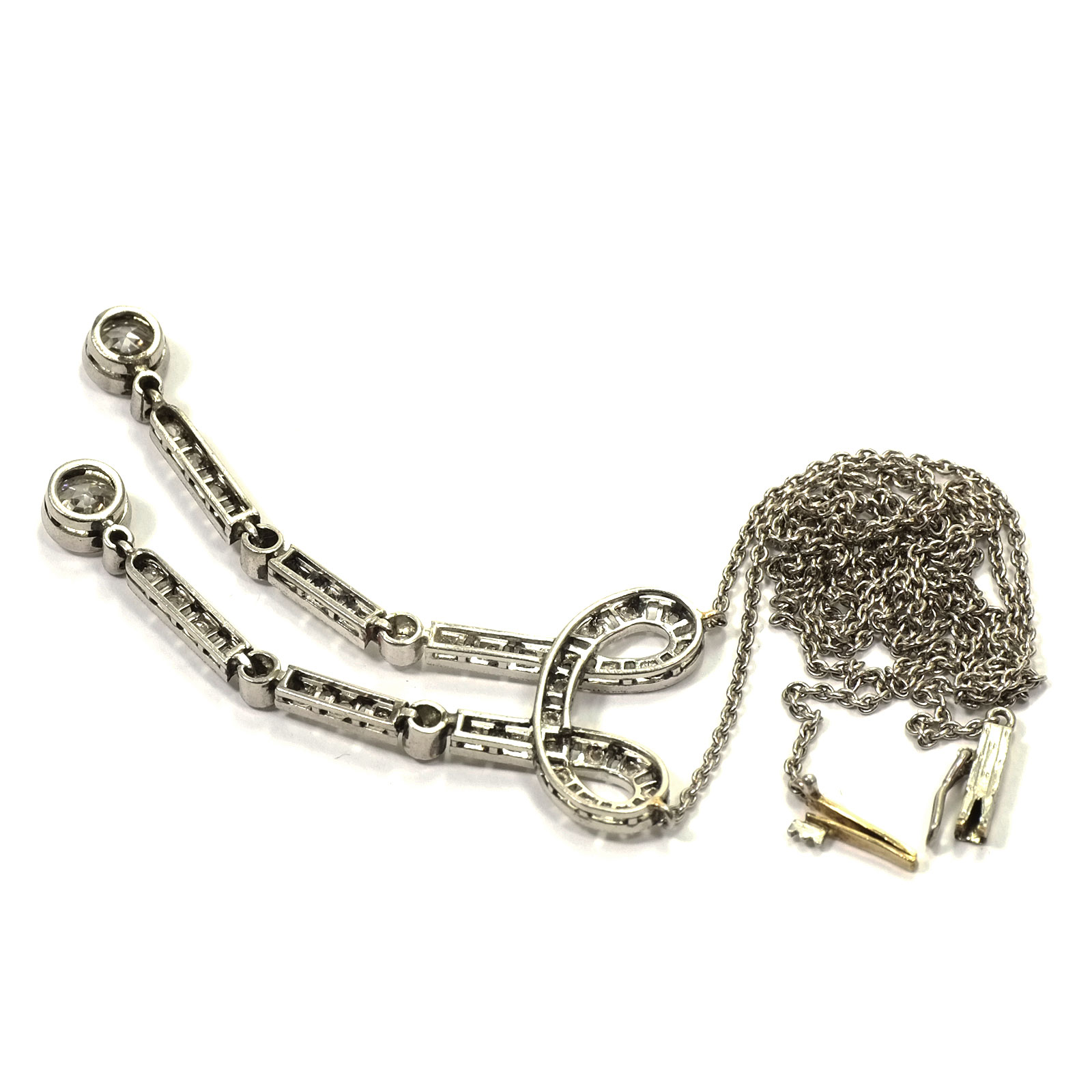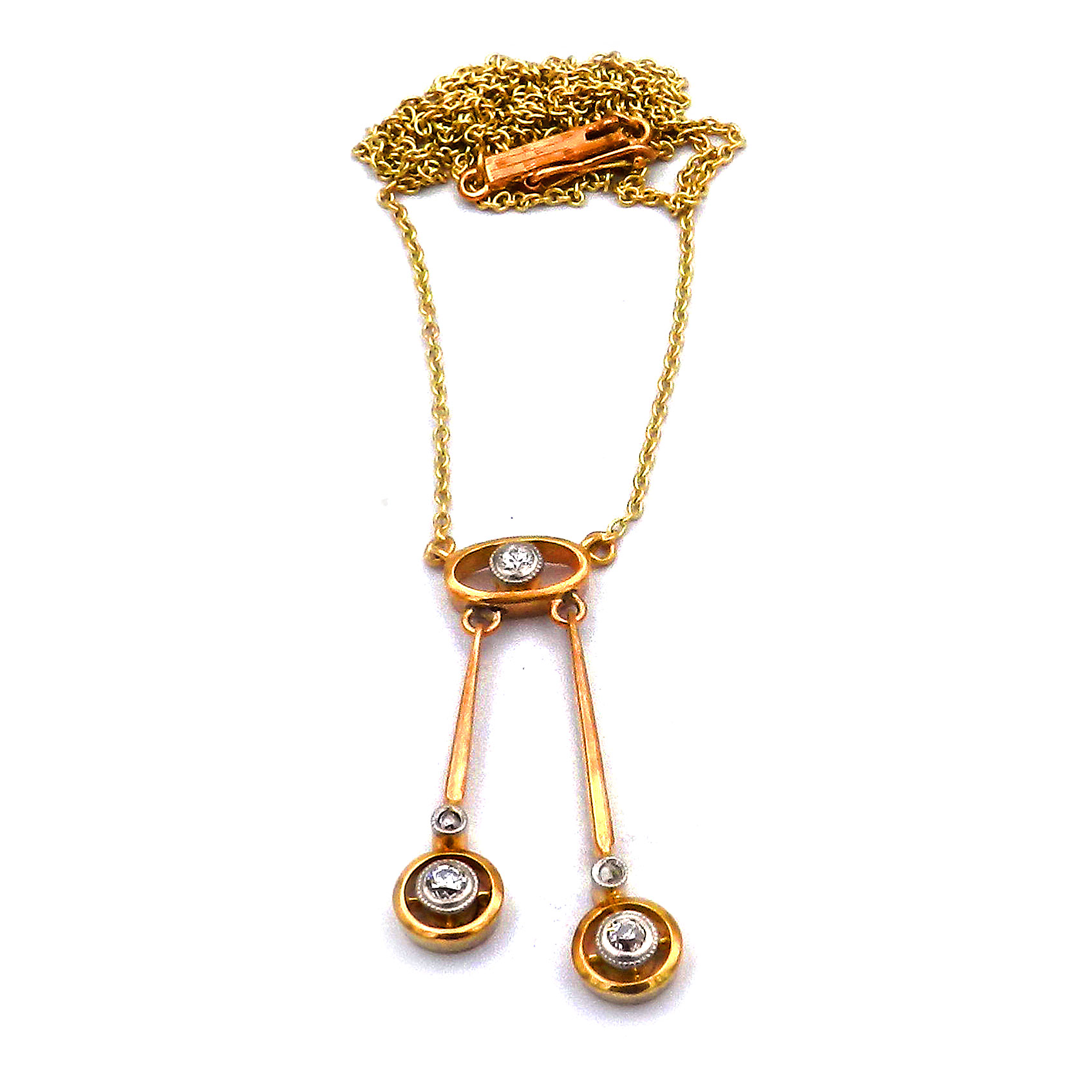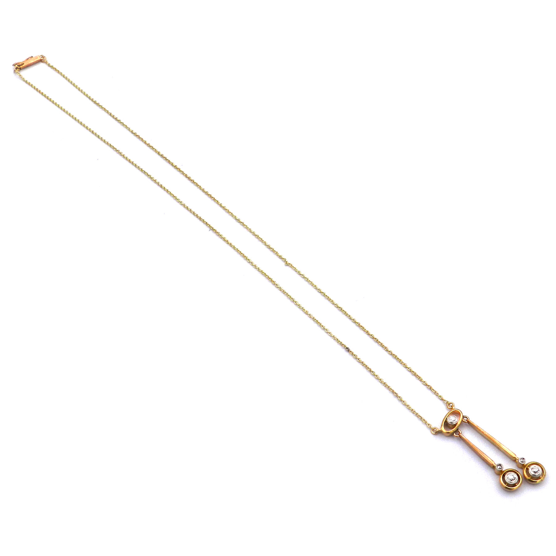Filigranes Jugendstil Gold Collier sogen. Colliette aus 18K/750 Gold. Das dekorative Mittelteil bestehend aus filigran durchbrochenen Elementen, im Verlauf aneinander gereiht und in einer zarten stäbchenförmigen Kette endend. Der Verschluss mit Federring sorgt für sicheren Halt. Das historische Goldcollier entstand um 1910 in Paris. Mit einer Länge von 40 cm wird die zauberhafte Goldkette halsnah getragen.
