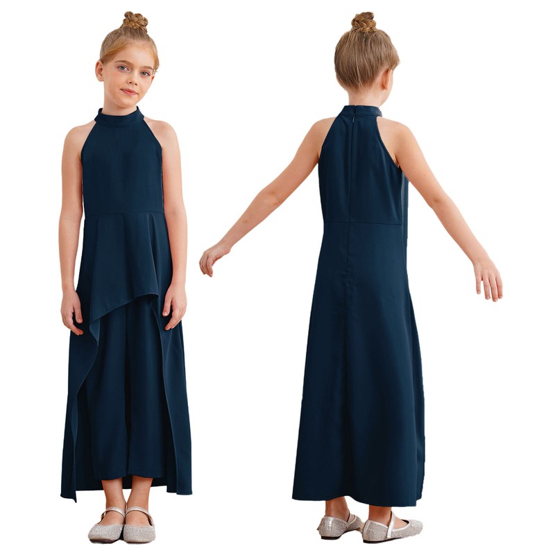 Girl’s jumpsuit with high-low irregular skirt makes your child look elegant and visually prolongs the legs.