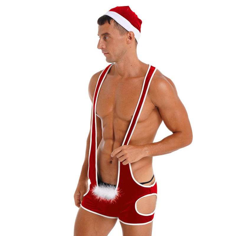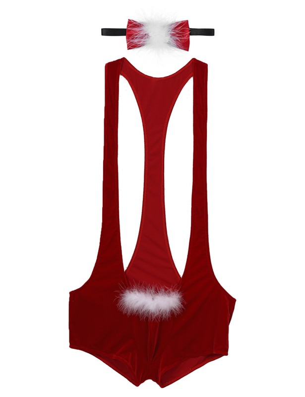 Men Christmas Singlet Cutout Velvet Bodysuit Feather Trimming Bulge Pouch Open Butt Jumpsuits with Hat.