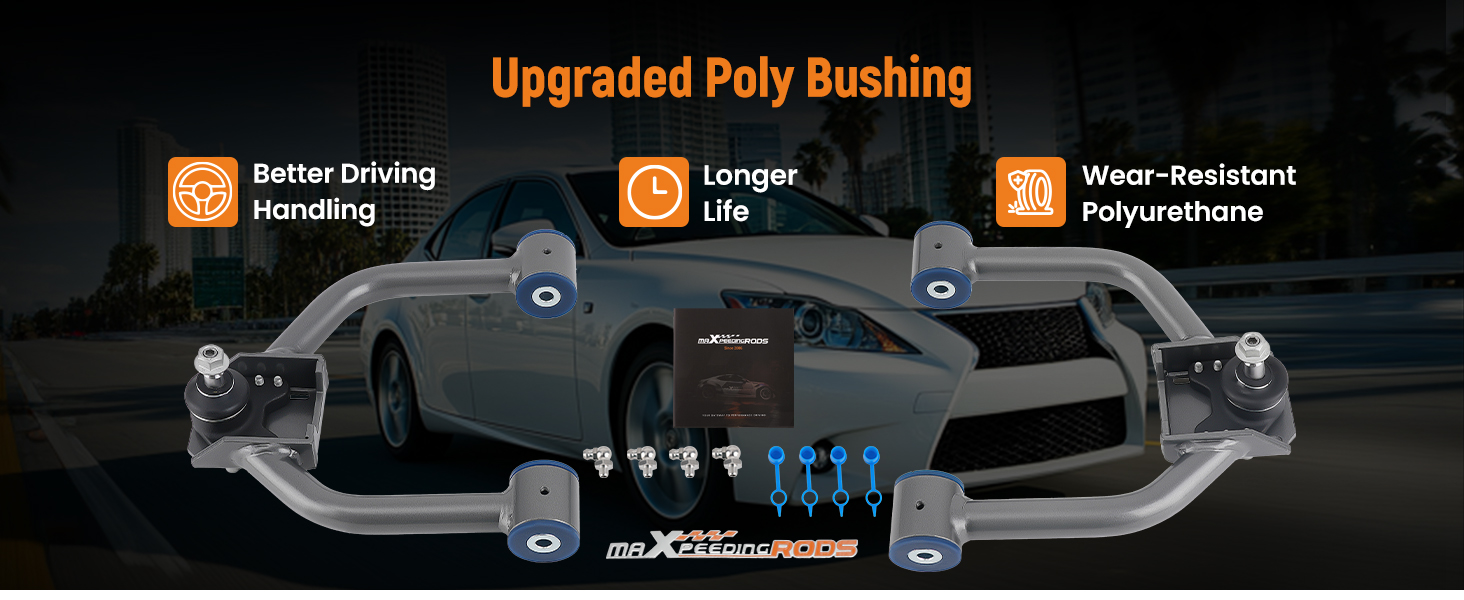 - High-quality poly bushings reduce abnormal squeaks and vibrations while driving, eliminate uneven tire wear, and allow you to enjoy a comfortable ride with ease