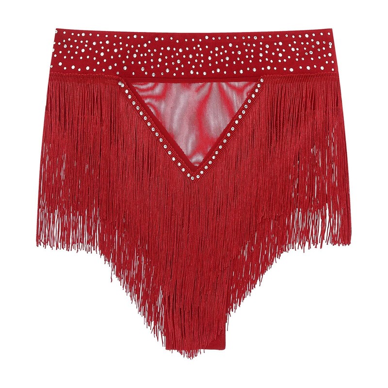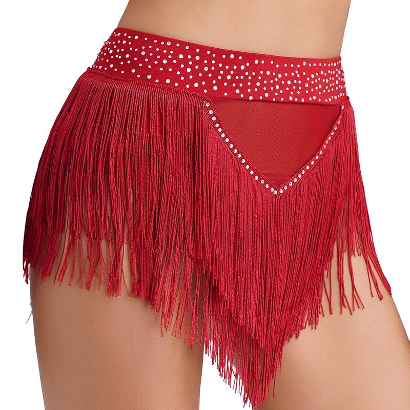 Rhinestones are sparkly around waistline and mesh patchwork. 2-layer tassels modify waist shape and swing charmingly with the rhythm of music.