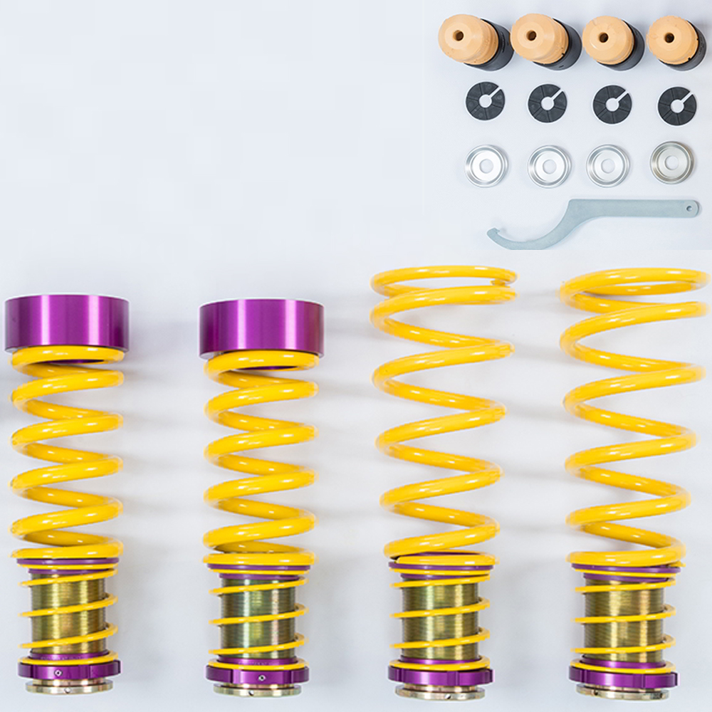 Der KW höhenverstellbare Federsatz wird zur Tieferlegung des Fahrzeugs in Kombination mit den serienmäßigen Dämpfern verwendet. Im Gegensatz zu herkömmlichen Federsätzen ist eine individuelle Höhenanpassung innerhalb des geprüften Einstellbereichs möglich. Bei dieser Lösung kommen fahrzeugspezifische Federaufnahmen mit abgestimmten KW Tieferlegungsfedern und passenden Elastomeren sowie Staubschutzsystemen zum Einsatz. Das serienmäßige Dämpfersystem zum Beispiel mit elektronischer oder hydraulischer Regelung bleibt weiterhin aktiv.