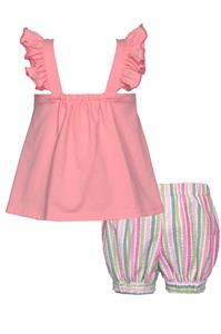 - Pink tee knit fabric with shoulder ruffles