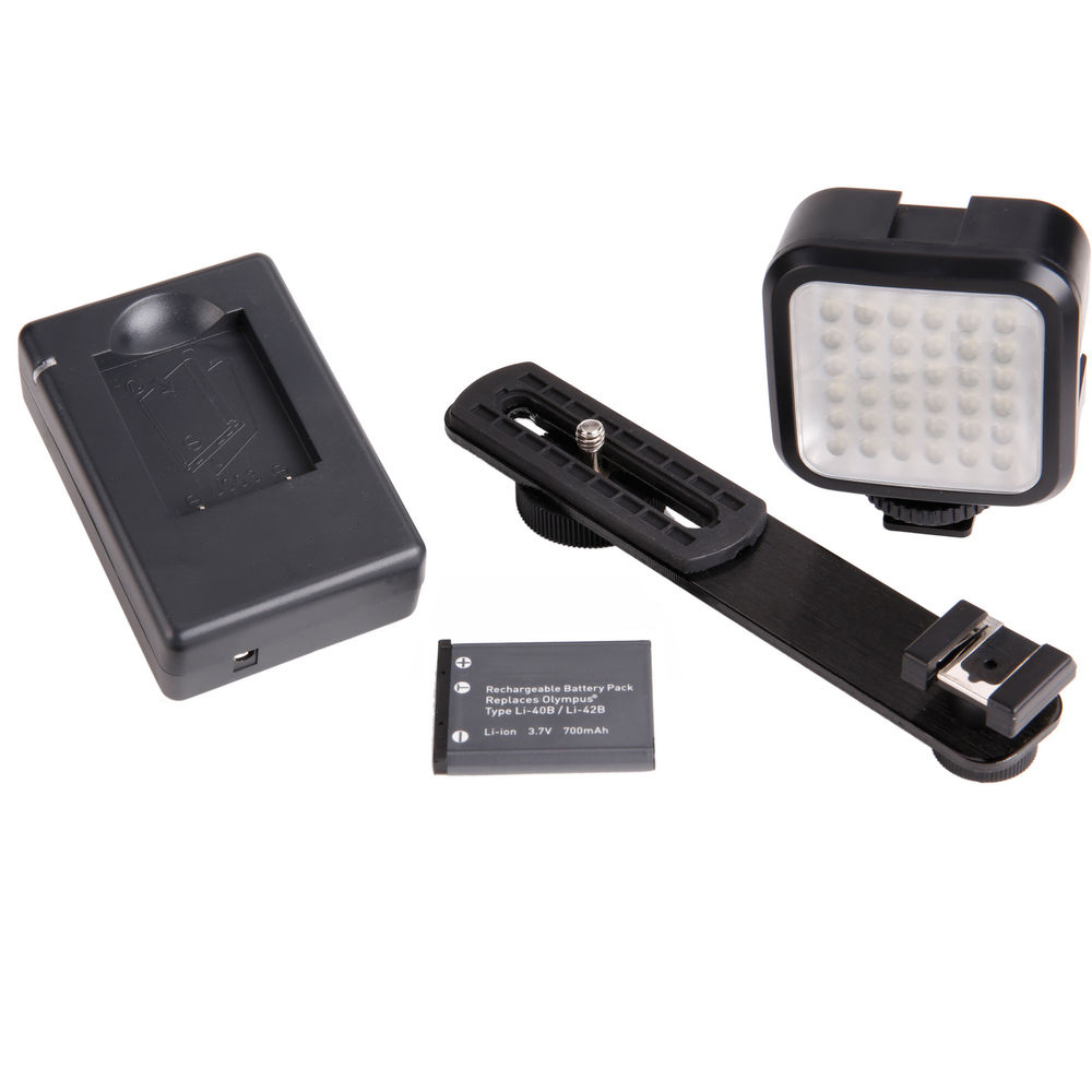 LED light kit comes with a rechargeable lithium Ion battery, charger & bracket. An array of 36 powerful LED's provide bright, even lighting to a range of 35 feet. A unique interlocking design allows stacking of units to create a multi-unit array. It lasts up to 3 hours total run time. It securely connects to the shoe mount on most digital cameras and camcorders. Bracket and charger are also included.