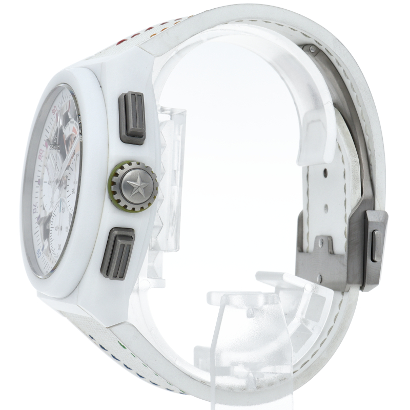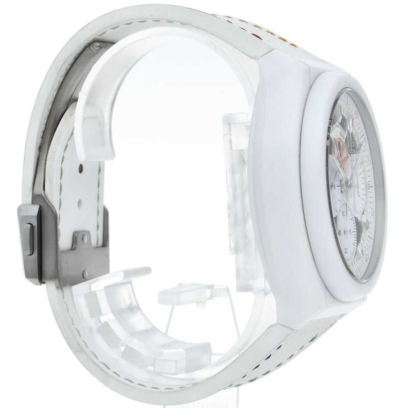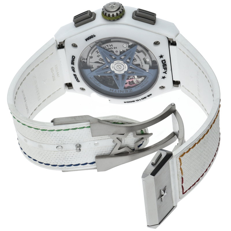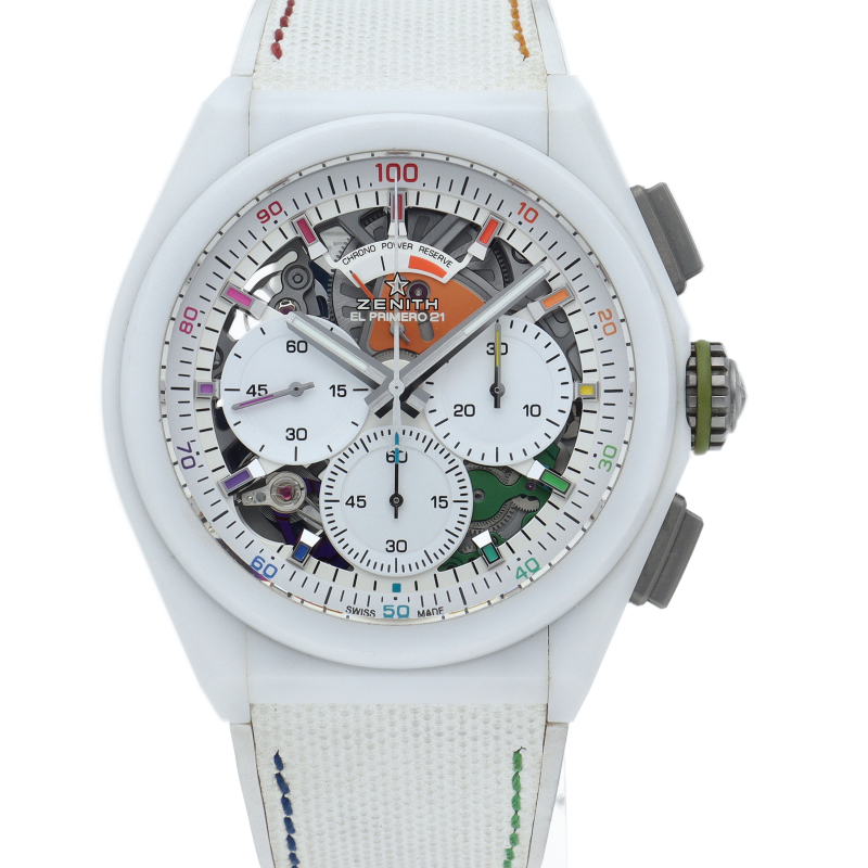 | The Defy 21 Chroma, a 2022 model, is equipped with the high-frequency 1/100 second accurate El Primero 21 chronograph. The combination of the skeleton dial with colorful movement pieces and rainbow color gradient markers and the 1.7" matte white ceramic case gives it a very stylish look. |