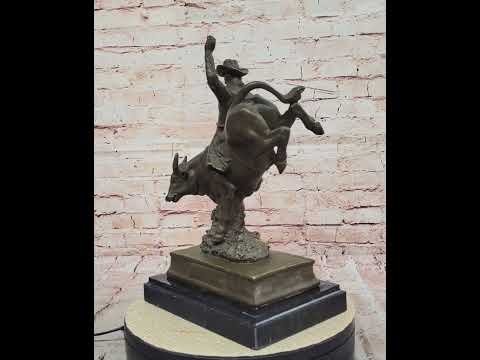 This dynamic Western Cowboy Riding a Rearing Angry Bull sculpture captures the high-octane energy and fearless spirit of the rodeo. Modeled in the iconic style of Frederic Remington, this piece brings to life the thrilling moment when a cowboy tries to tame a wild, bucking bull. The intensity in the bull's posturemdash;muscles tense, front legs raised, and nostrils flaringmdash;perfectly contrasts with the cowboy’s confident grip and focus.