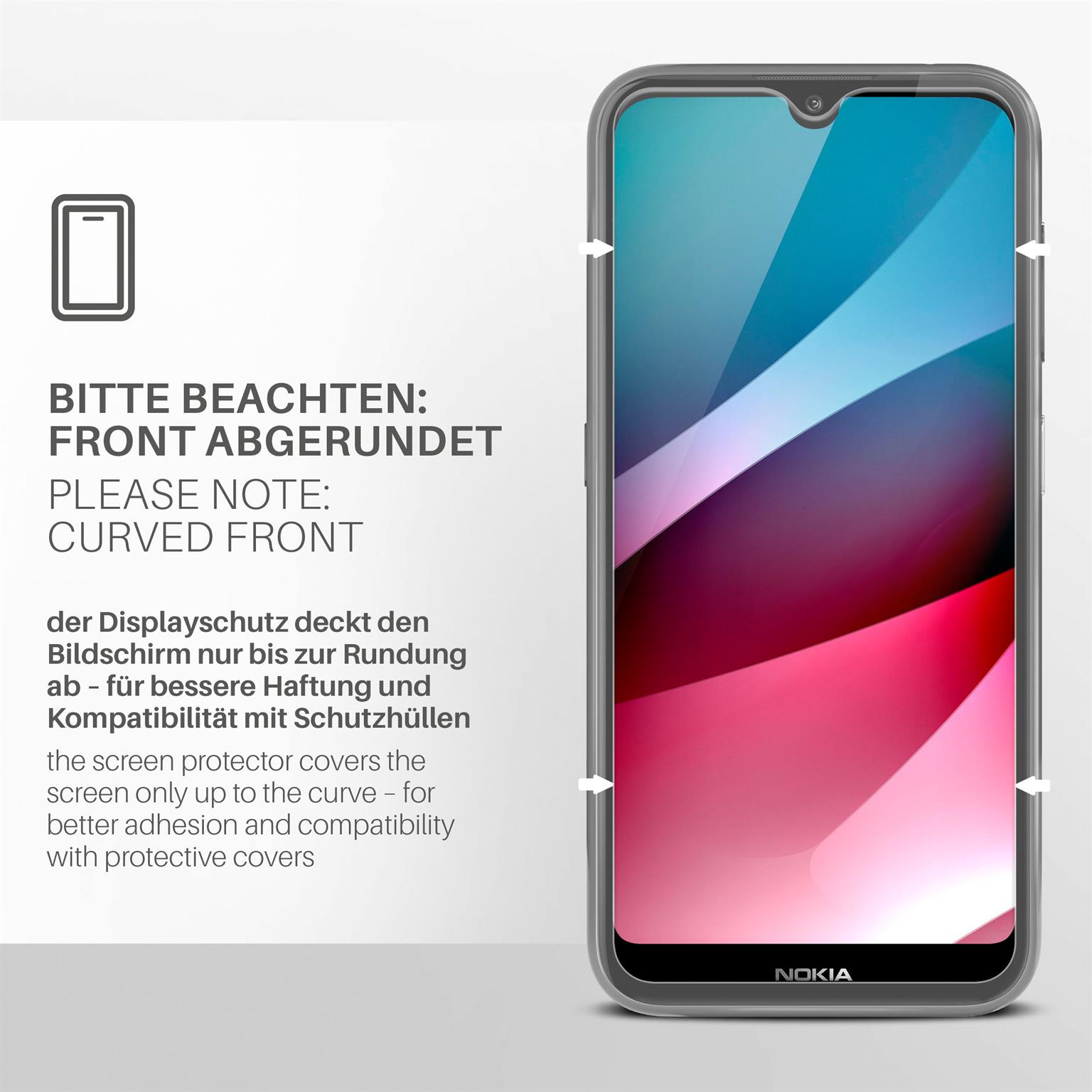 Das Frontglas ist passgenau für das Nokia 3.2 - exakt auf die gerade Fläche angepasst. Die Kanten und Aussparungen der Handyfolie sind sauber und präzise verarbeitet