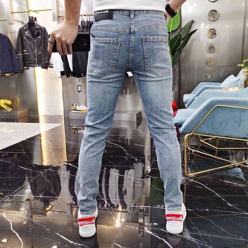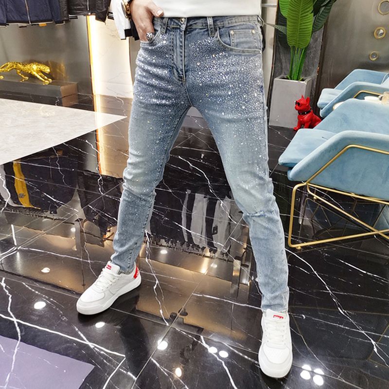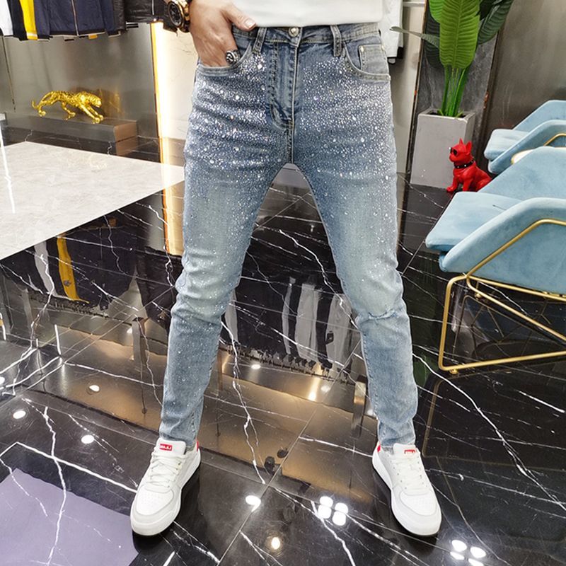 New Men Luxury Blue Jeans Diamond Rhinestones Fashion Trousers High Quality