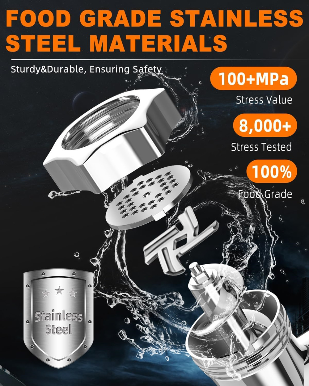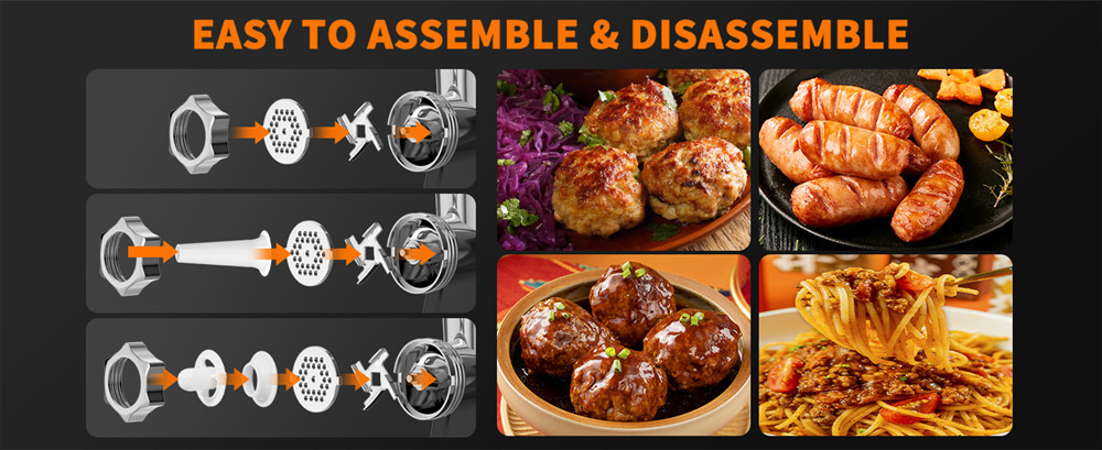 The aluminum alloy machine head and tray, 304 stainless steel blade and grinding plates, pure copper motor, three-section spiral meat grinding shaft, and food-grade ABS shell offer wear resistance, and great durability. All components and accessories are easy to clean with water. 【Mincing Assistant Grinder】