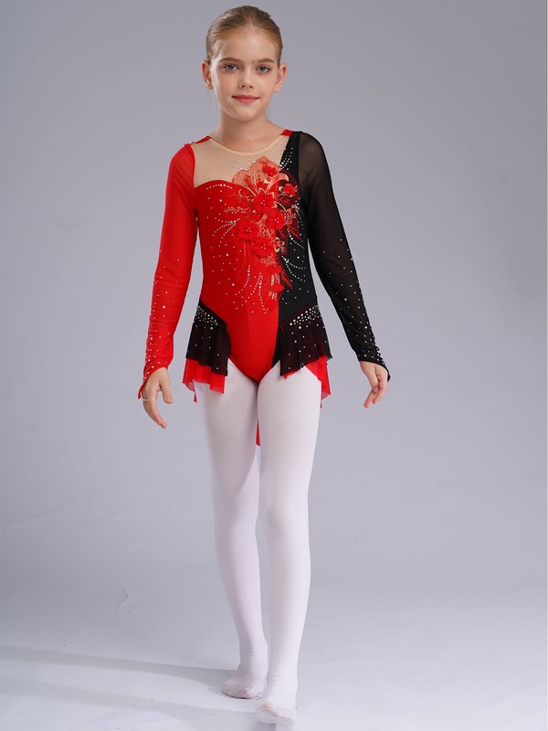 Girl’s dance leotard has curved hem mesh panel skirt with open front and color block design, which is flowy and shows the beauty of dance.
