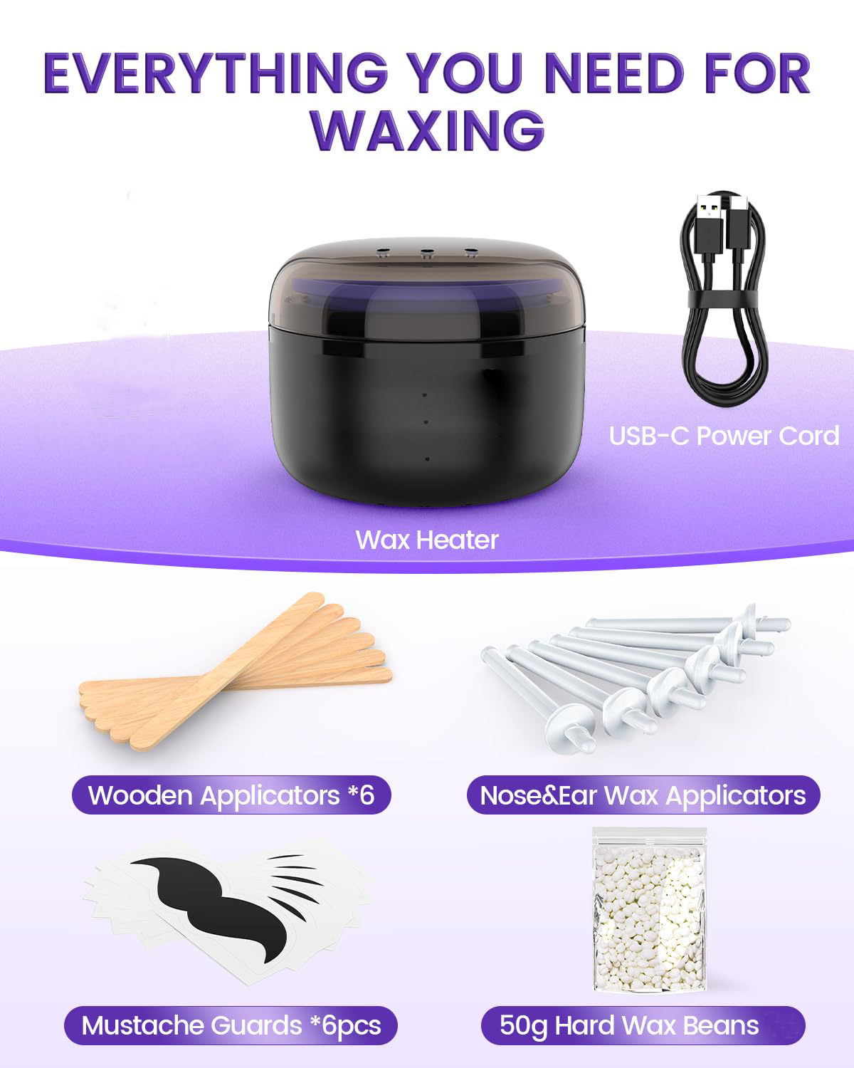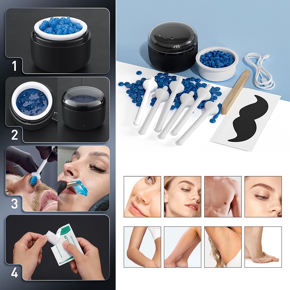 - 【Package Contents】: The hard wax kit for hair removal contains everything you need for a small-area waxing experience. It includes a mini heating wax machine*1, 1* silicone pots, 6 wooden sticks, 6 plastic nose sticks, 50g wax beans, and 5 packs of wet wipes. Just one kit for all your small area waxing needs