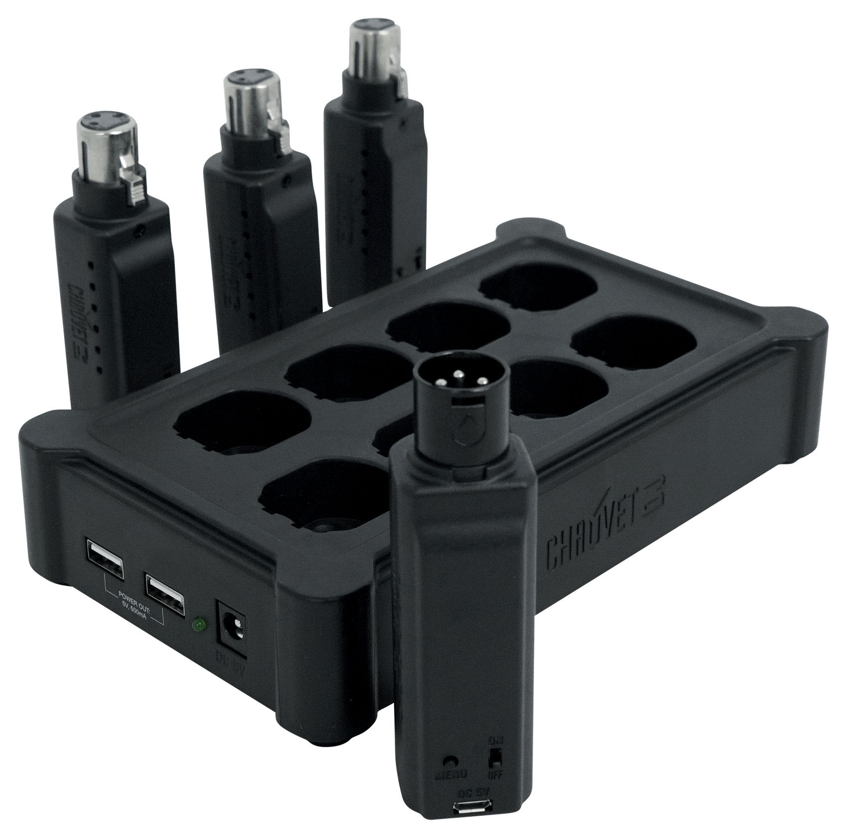 Make any DMX-compatible light wireless! The wonders of wireless DMX control have arrived to previously non-wireless lights with D-Fi XLR. This cutting-edge technology provides instant wireless communication through compact battery-powered wireless D-Fi receiver or transmitter units that plug directly into the XLR port of DMX-compatible lights. Contact pins charge all D-Fi XLRs without the need for any cables. The D-Fi XLR Pack includes 1 transmitter, 3 receivers and 1 multi-charger. The multi-charger simultaneously charges up to 8 D-Fi XLRs (additional units sold separately). D-Fi XLR Pack even has 2 additional USB ports to charge additional devices.