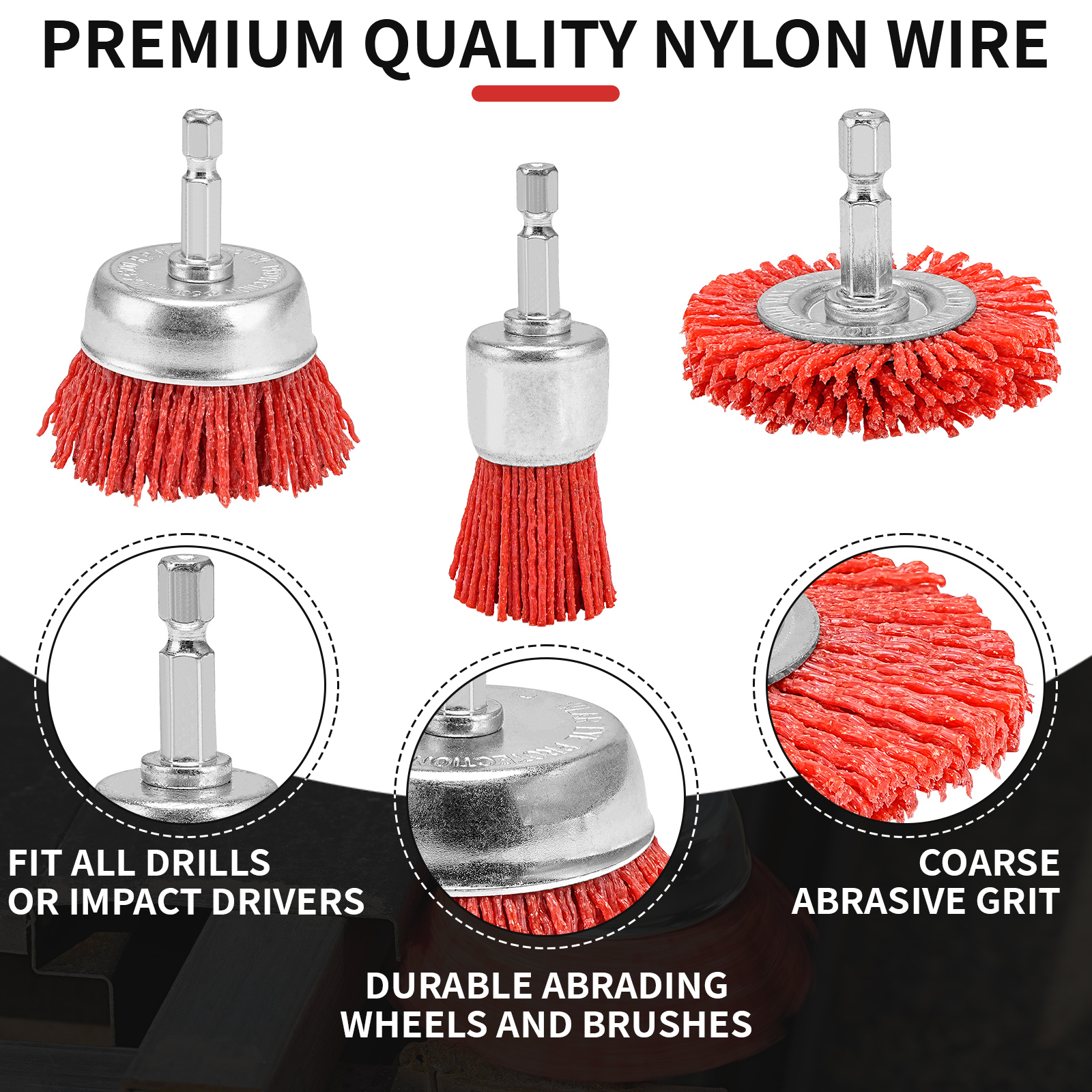 【Wide range of application】:1/4 inch hex handle nylon filament abrasive wire brush can be used with any drill or Impact Drivers