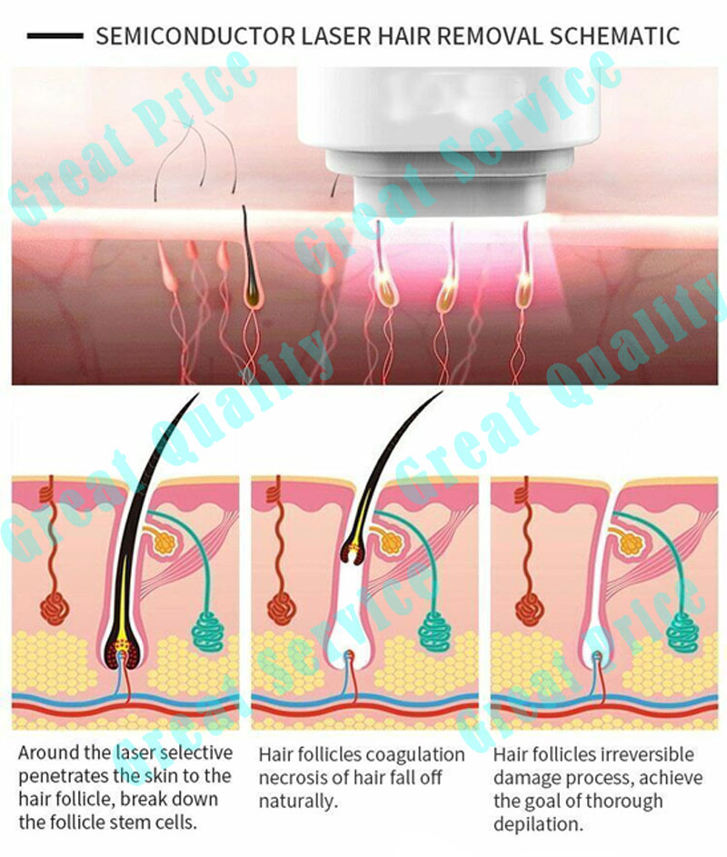 The laser light can be absorbed by hair shaft and hair follicles in the melanin, and converted into heat, thus increasing the hair follicle temperature. When the temperature raises high enough To irreversibly damage the hair follicle structure, which disappear after a period of natural physiological processes of hair follicles and thus achieve the purpose of permanent hair removal.