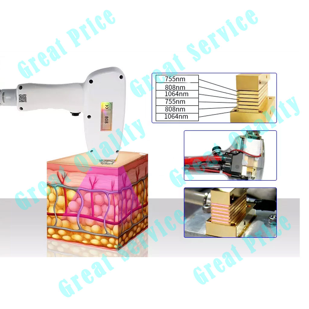 The system uses the optimal hair removal wavelength of 808nm 755nm and 1064nm diode for deep penetration into the dermis where the hair follicle is located. In treatment procedure, a series of low fluence, high repetition pulses increases the temperature of both the hair follicle and the Surrounding, nourishing tissue to 45 degree Celsius. This more gradual heat delivery uses the chromophores into the surround tissue as reservoirs to effectively heat up the hair follicle. This, along with the heat energy absorbed directly by the hair follicle, damages the follicle and prevents Re-growth.