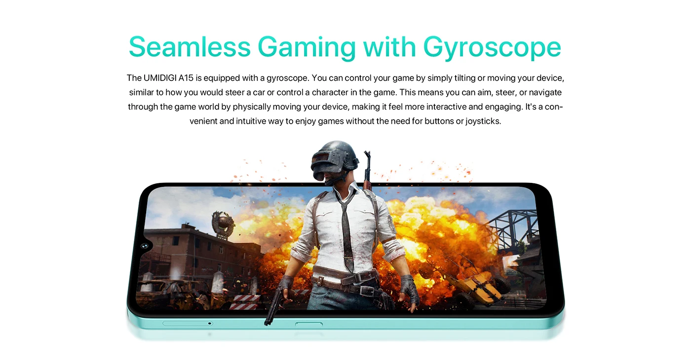 The UMIDIGI A15 is equipped with a gyroscope. You can control your game by simply tilting or moving your device, similar to how you would steer a car or control a character in the game. This means you can aim, steer, or navigate through the game world by physically moving your device, making it feel more interactive and engaging. It's a convenient and intuitive way to enjoy games without the need for buttons or joysticks.