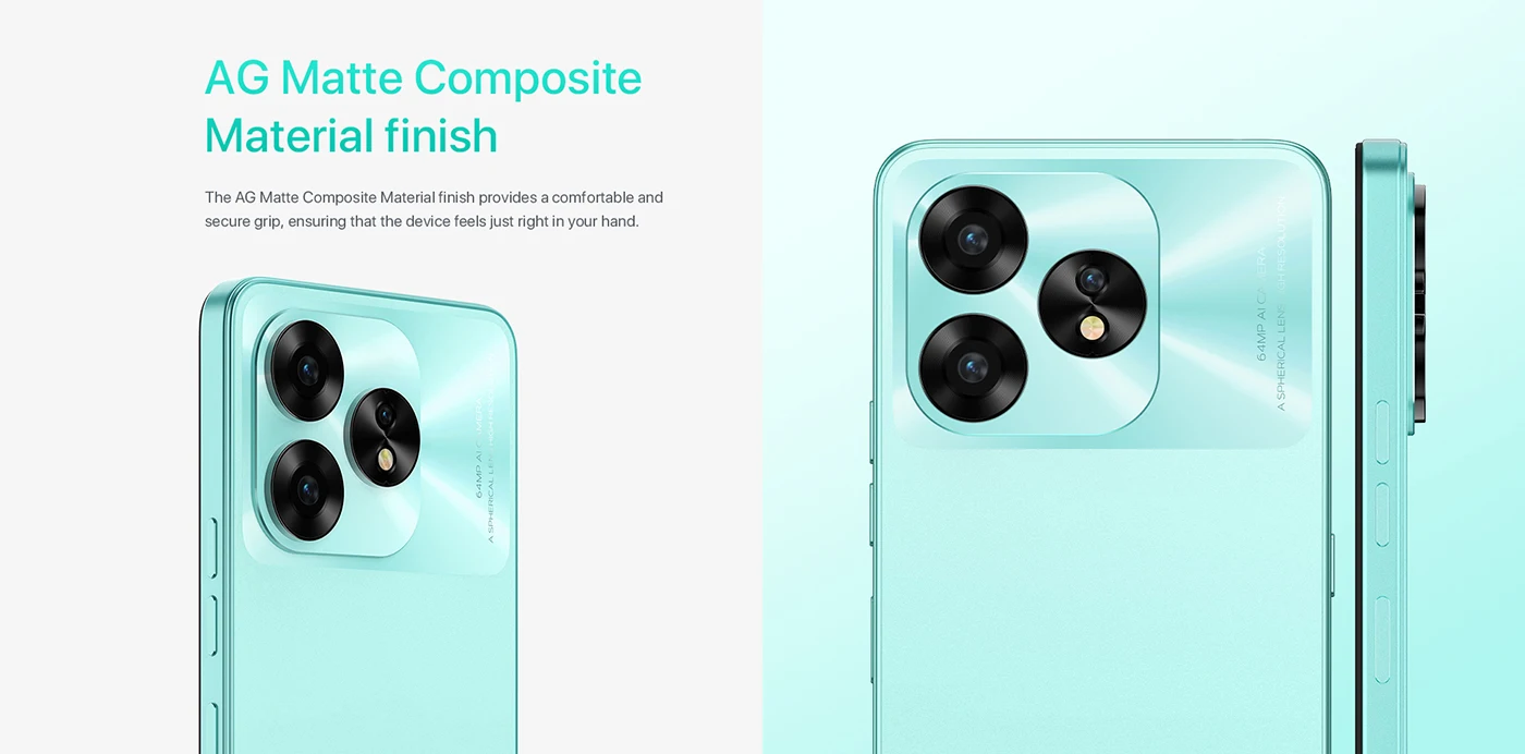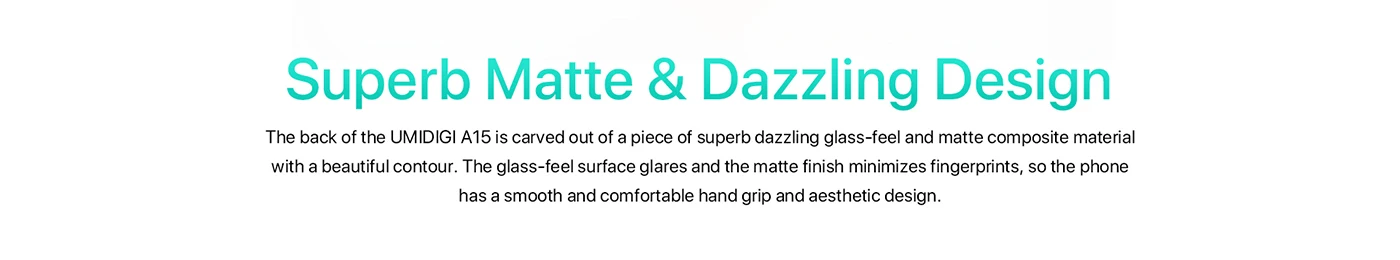 The back of the UMIDIGI A15C is carved out of a piece of superb dazzling glass-feel and mattecomposite material with a beautiful contour. The glass-feel surface glares and the matte finish minimizes fingerprints, so the phone has a smooth and comfortable hand grip and aesthetic design.