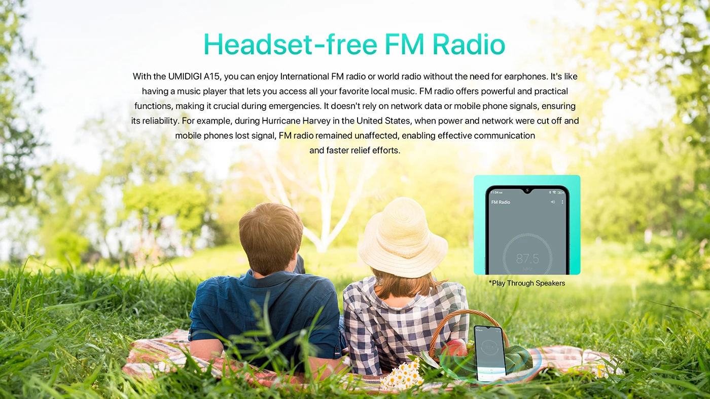 With the UMIDIGI A15, you can enjoy International FM radio or world radio without the need for earphones. It's like having a music player that lets you access all your favorite local music. FM radio offers powerful and practical functions, making it crucial during emergencies. It doesn't rely on network data or mobile phone signals, ensuring its reliability. For example, during Hurricane Harvey in the United States, when power and network were cut off and mobile phones lost signal, FM radio remained unaffected, enabling effective communication and faster relief efforts.