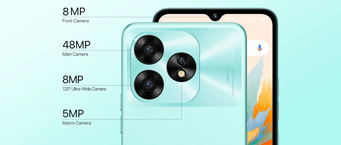 The UMIDIGI A15C features an impressive camera setup that includes a 48MP ultra-clear main camera, an 8MP ultra-wide camera, a 5MP macro camera, and a 8MP front camera.