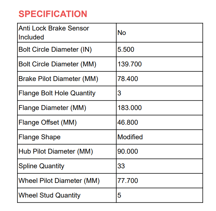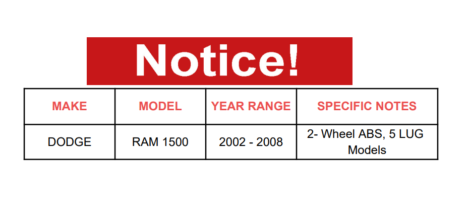 | DODGE | RAM 1500 | 2002 - 2008 | 2 - Wheel ABS, 5 LUG Models |