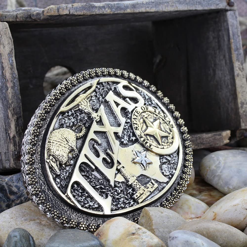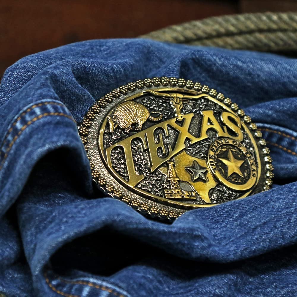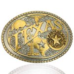 Small, oval cast Attitude belt buckle in antiqued nickel-tone and brass-tone finish, framed with a polished wire trim. Large lettering spelling out TEXAS stretches boldly across, surrounded by a set of antiqued figures in celebration of Texas heritage including a longhorn head, armadillo, oil well, the state of Texas and the Lone Star seal. Our cast belt buckles are acid washed to add the dark antiqued patina and hand buffed to bring out the highlights and details. Standard 1.5" belt swivel.