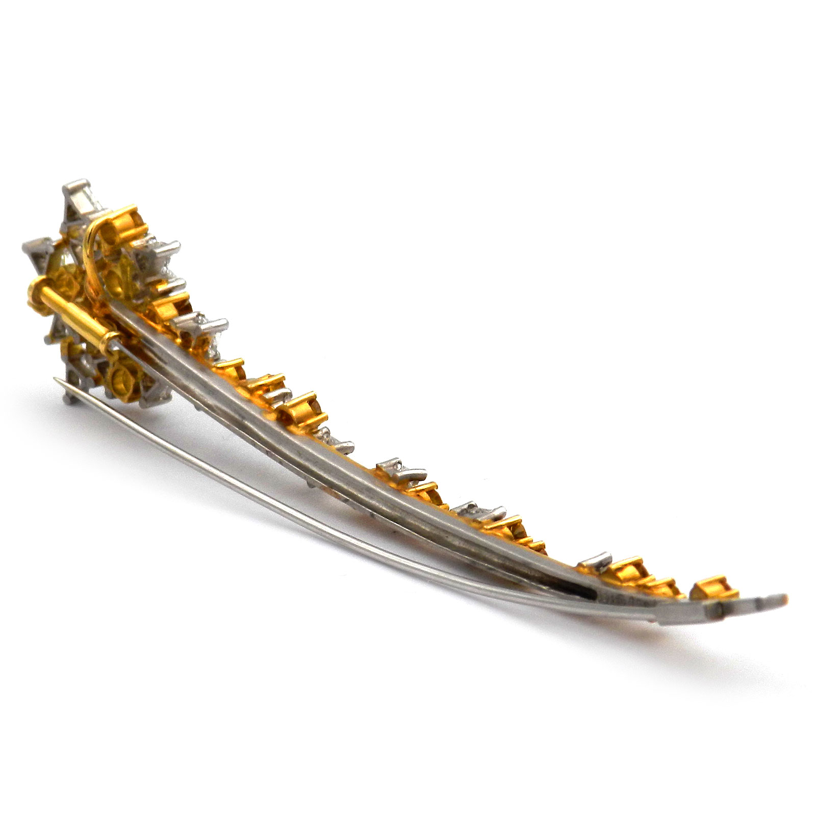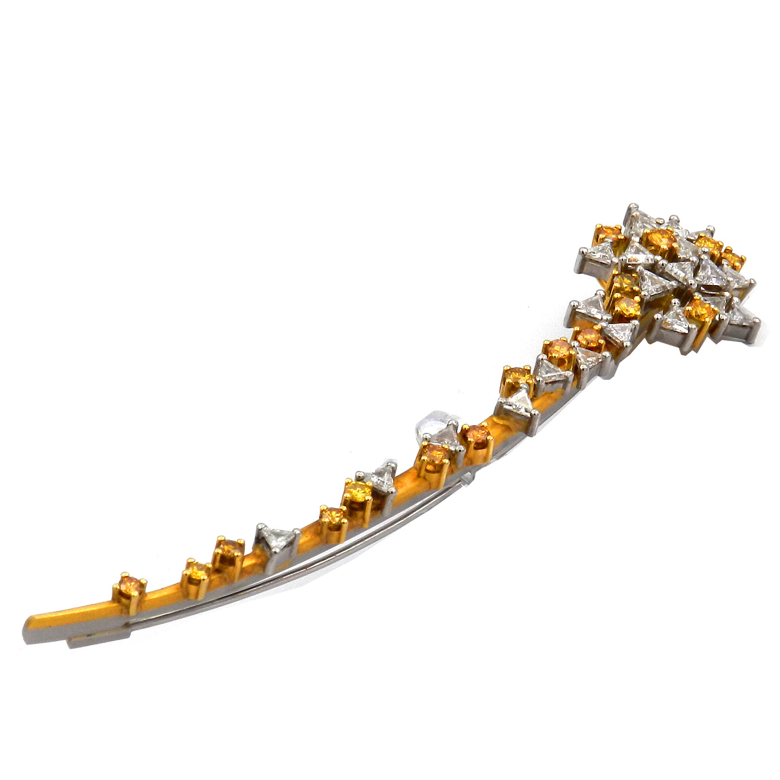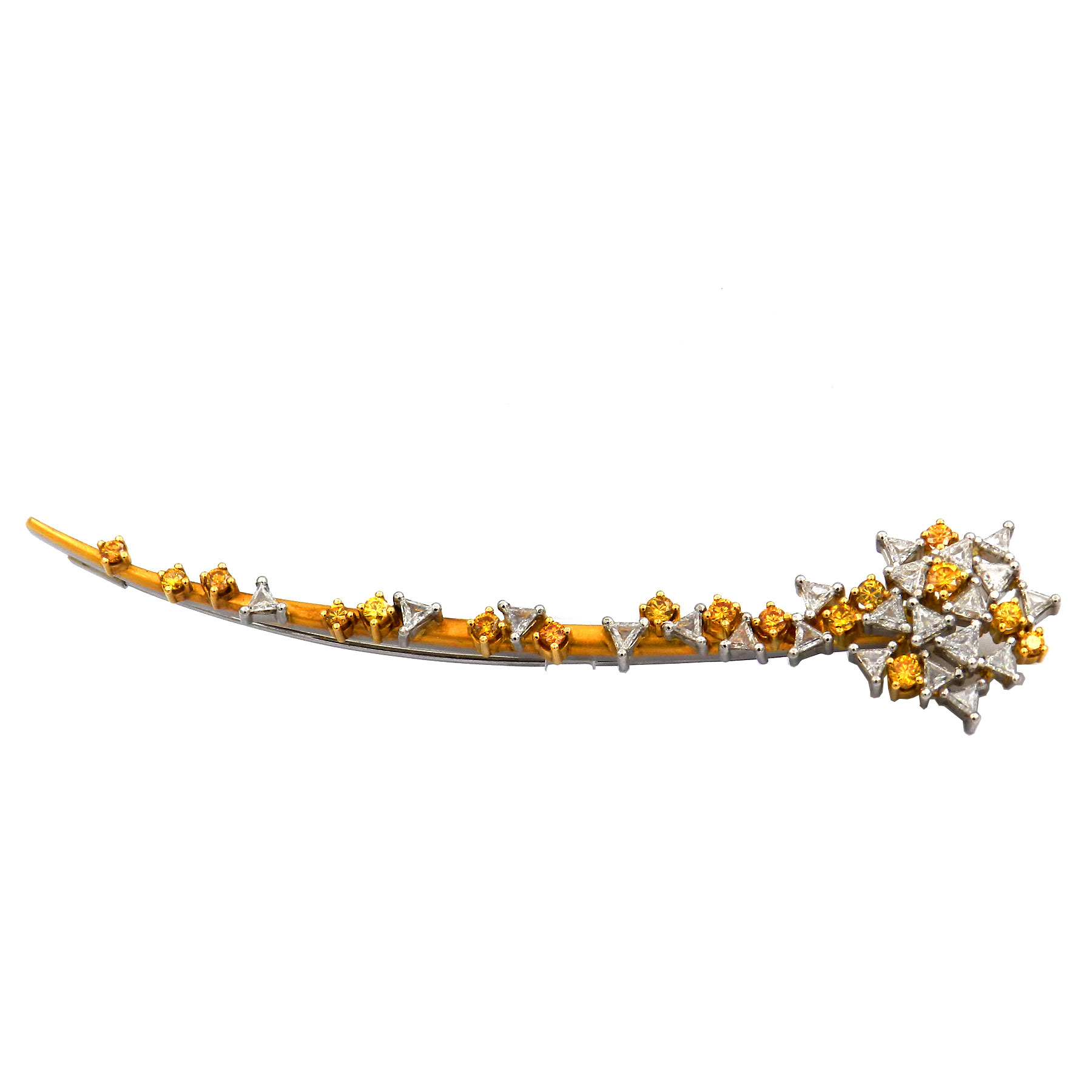 Extravagante Diamant Brosche in Form aus einer Sternschnuppe aus Platin und 18K/750 Gelbgold, üppig besetzt mit goldgelben und weißen Diamanten im Brillant- und Triangel-Schliff. In sorgfältiger Handarbeit wurden 22 weiße und 17 gelbe Diamanten mit zus. 3.5 ct verarbeitet. Die Oberflächen aus Platin und Gelbgold sind fein satiniert und stehen in spannendem Kontrast zu den strahlenden Diamanten. Die Brosche hat eine beeindruckende Länge von 9,5 cm und schließt mit einer Schiebesicherung.