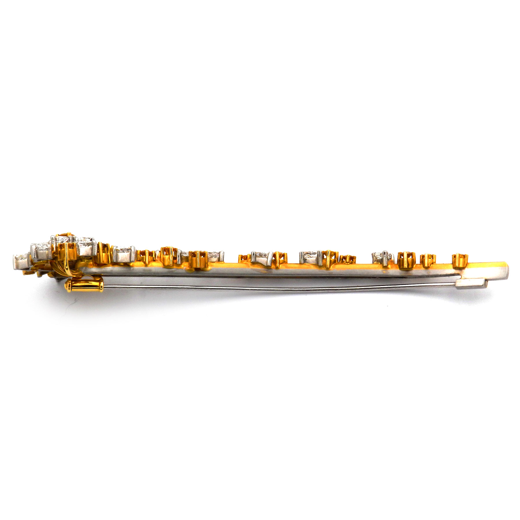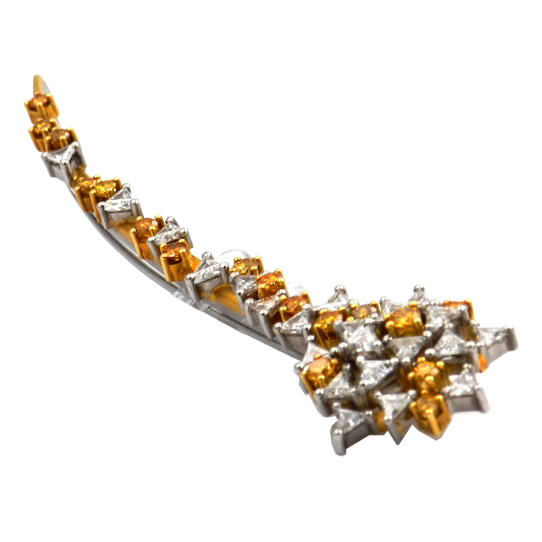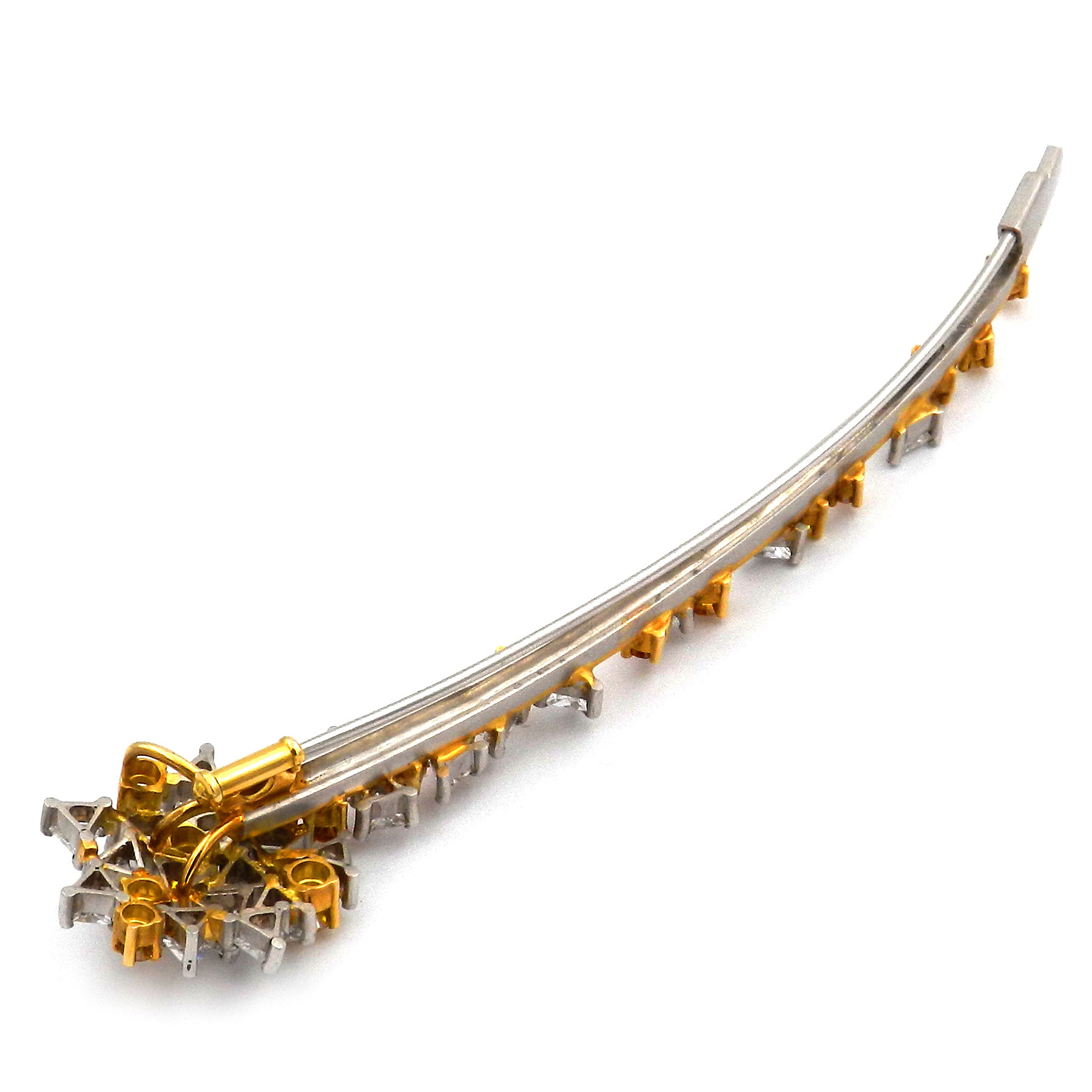 Extravagante Diamant Brosche in Form aus einer Sternschnuppe aus Platin und 18K/750 Gelbgold, üppig besetzt mit goldgelben und weißen Diamanten im Brillant- und Triangel-Schliff. In sorgfältiger Handarbeit wurden 22 weiße und 17 gelbe Diamanten mit zus. 3.5 ct verarbeitet. Die Oberflächen aus Platin und Gelbgold sind fein satiniert und stehen in spannendem Kontrast zu den strahlenden Diamanten. Die Brosche hat eine beeindruckende Länge von 9,5 cm und schließt mit einer Schiebesicherung.