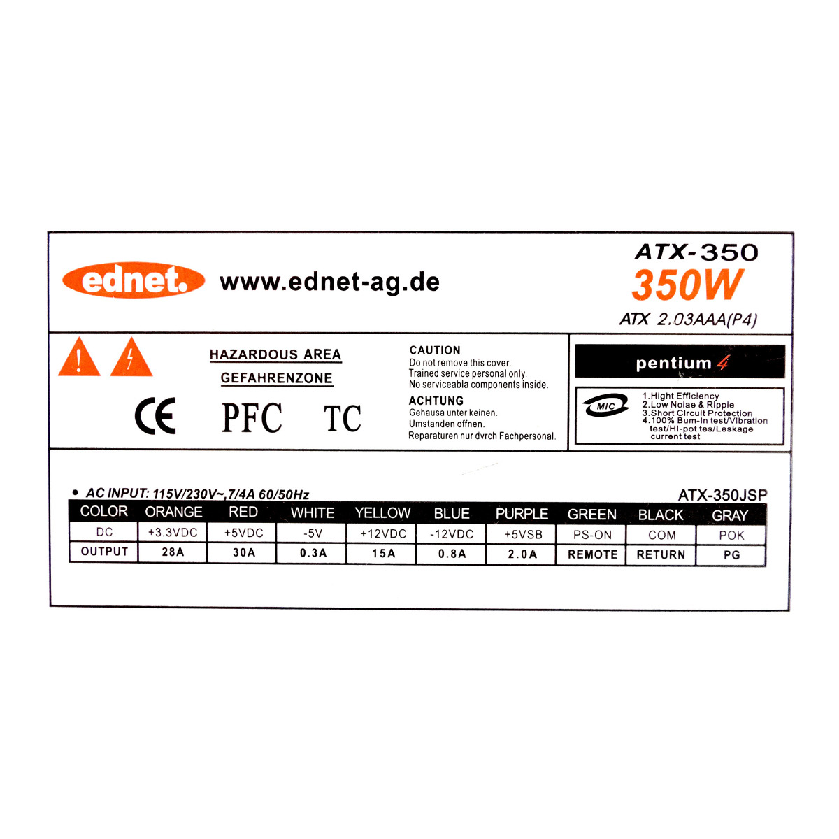 Netzteil EDNET. ATX-350 ATX 2.03AAA(P4) 350W ATX 20+4-PIN ATX12V SATA MOLEX FDD