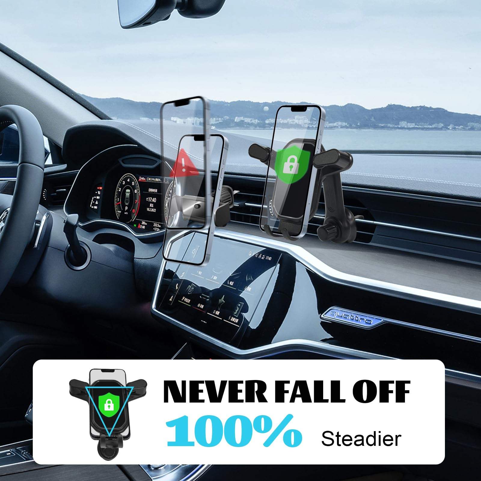 Car cell phone holder is designed as “hook shape”, though rotate the knob to attach & hook the louver tightly, built-in metal and ensure it won't break the hook, even bumpy road.
