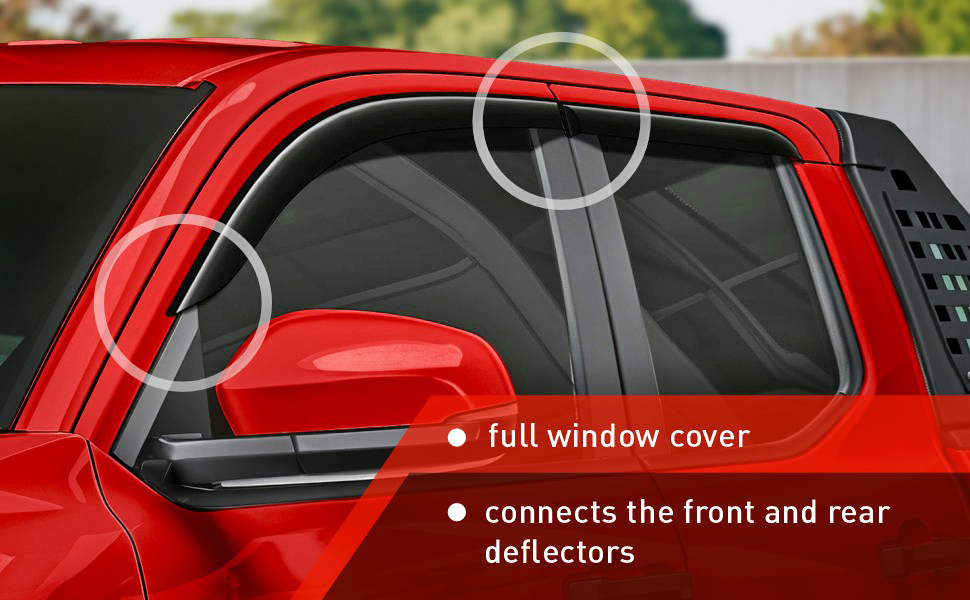 - Full-size Side Window Deflectors – This 4-piece set includes passenger and driver side rain guards that create a seamless look that protects you from sun rays, rain drops, and wind while you’re driving with the window down.