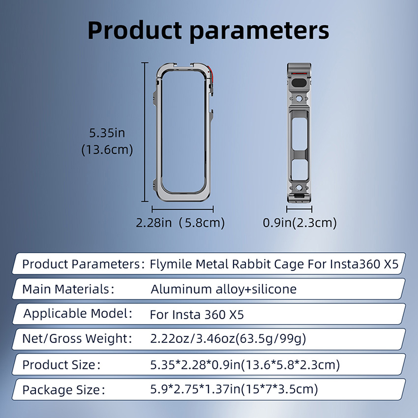 Features: l Tailor-made design, modeled after the real camera, fits snugly into the body l Equipped with a cold shoe port and 1/4 screw port, can be connected to external equipment such as photography lights and microphones l The bottom is equipped with a base connector to connect with tripods, selfie sticks and other photographic accessories l The side window is reserved for charging and replacing the memory card when using the rabbit cage, quick and easy to disassemble Specifications: l Material: Aluminum + Silicone (Lens Cap) l Size: 13.6x 5.8x 2.3cm ( Rabbit Cage ) l Quantity: 1 Set l Applicable Model: for Insta360 X5 Package: l 1x Rabbit Cage Metal Frame + 1x Lens Protective Cover + 6x Windproof Cottons