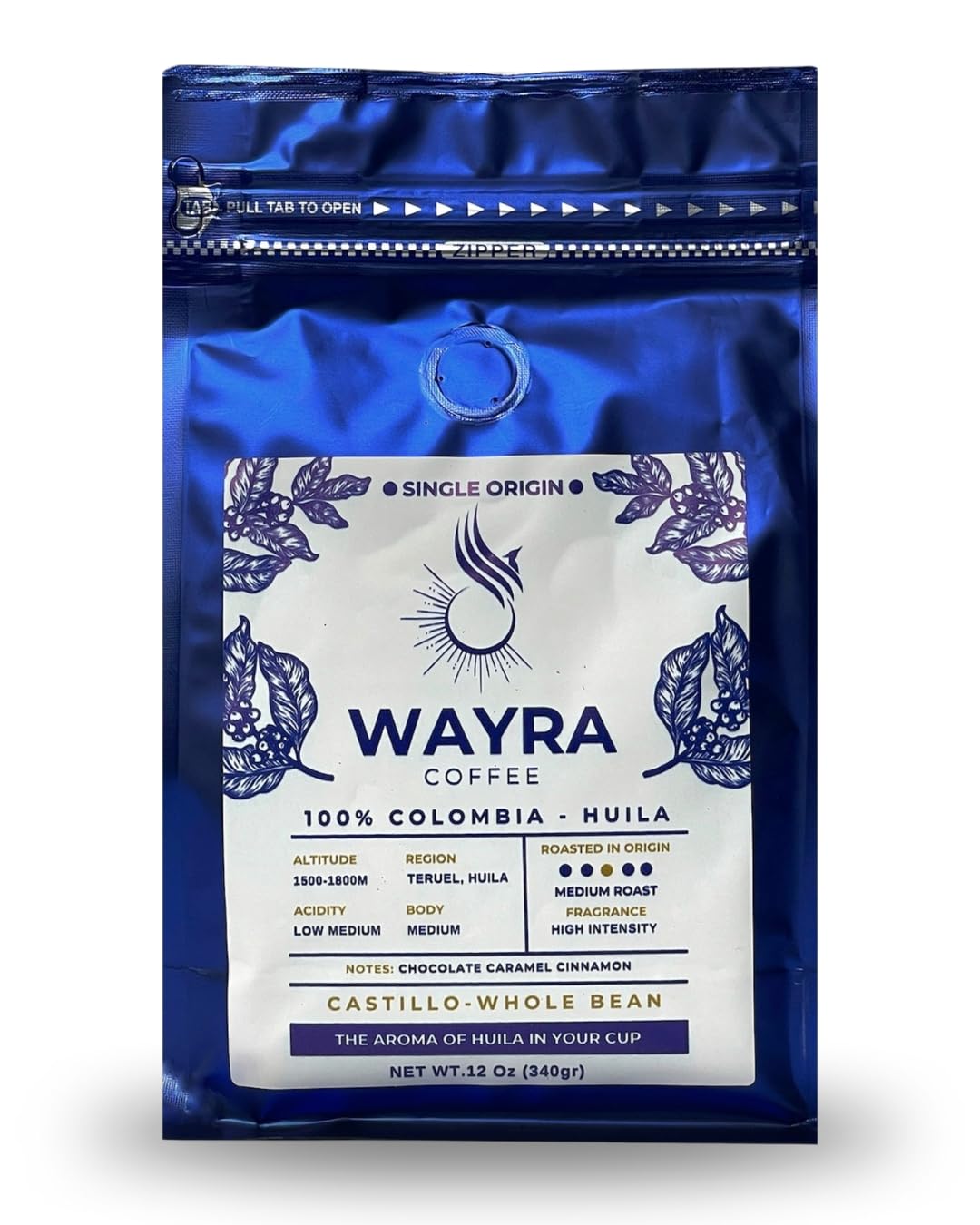 - PREMIUM QUALITY COFFEE - Cultivated at 1.500 / 1.800 MASL by the third generation of farmers located in Teruel Huila in the foothills of the central Andes mountain valley of the Magdalena River, using environmentally friendly agricultural practices protecting biodiversity of the region, our coffee beans grow between sunny mountains and surrounded by cloud forests with soils derived from volcanic ash, are carefully hand selected and we produce our Wayra Premium Coffee beans medium roast (Castillo variety).