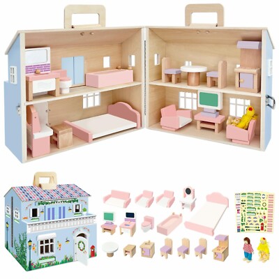 TAKE THE FUN ANYWHERE: This foldable wooden doll house for kids ages 3+ is designed for easy play on the go! It features a secure metal latch and a sturdy handle, so kids can open, close, and carry their little dream home wherever they like. As a portable dollhouse with furniture, all accessories and dolls can be neatly stored inside after playtime - helping kids develop good organization habits. Whether at home or on the go, kids can bring their dollhouse world with them anywhere