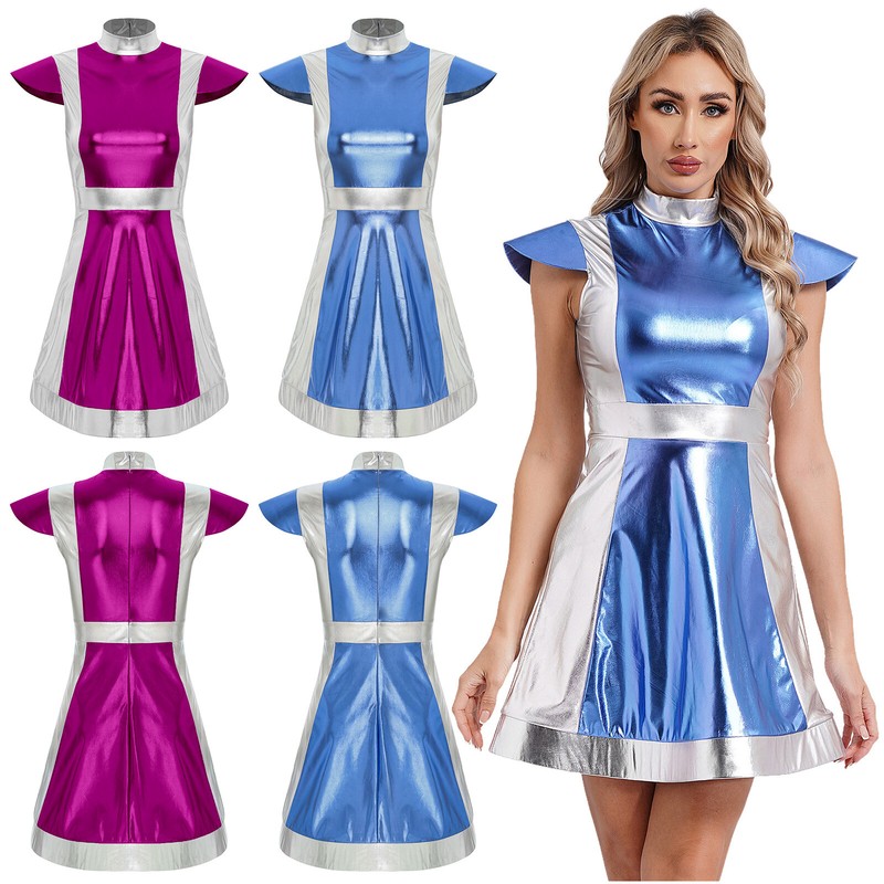 Metallic shiny fabric has unique luster and brings a very futuristic look. Contrast design makes a slim effect to make you sexy.