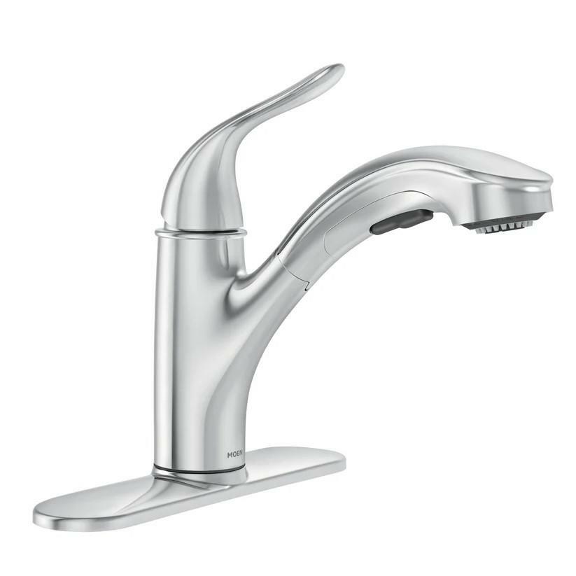 - Pullout hose offers flexible water delivery and hose retracts with ease