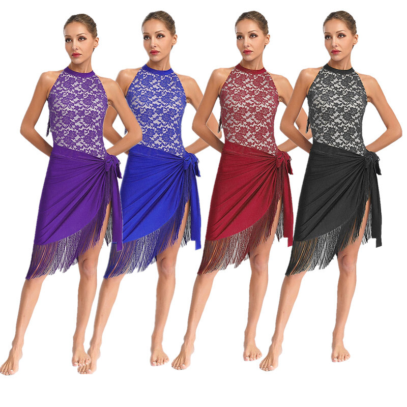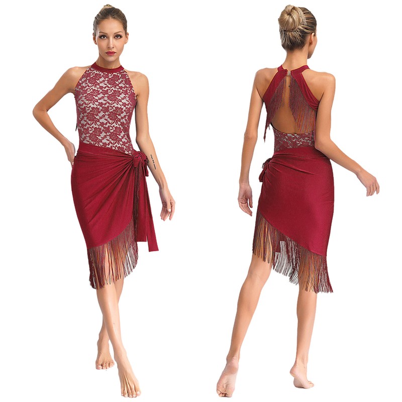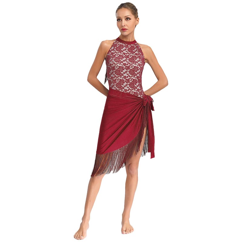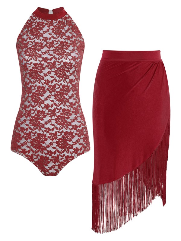 DE iEFiEL Damen Latein Tanz Outfits Neckholder Spitze Leotard mit Fransen Rock