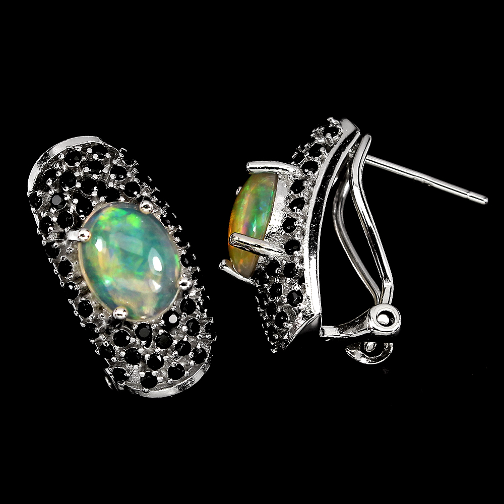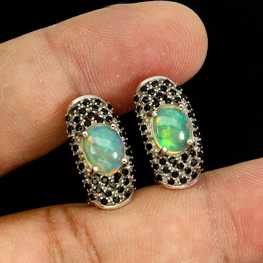 Unheated Oval Fire Opal 9x7mm Black Spinel 925 Sterling Silver Earrings