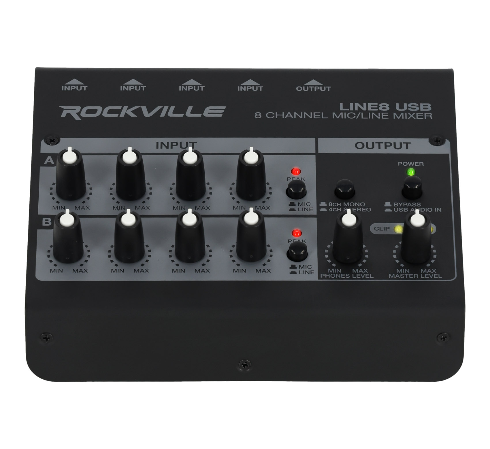 The Rockville LINE8 USB 8 Channel Mic/Line Mixer is a versatile audio device designed for various applications.