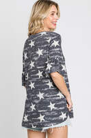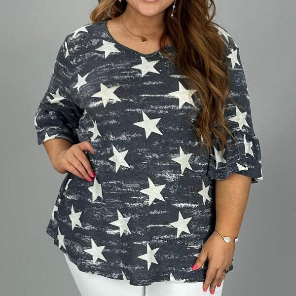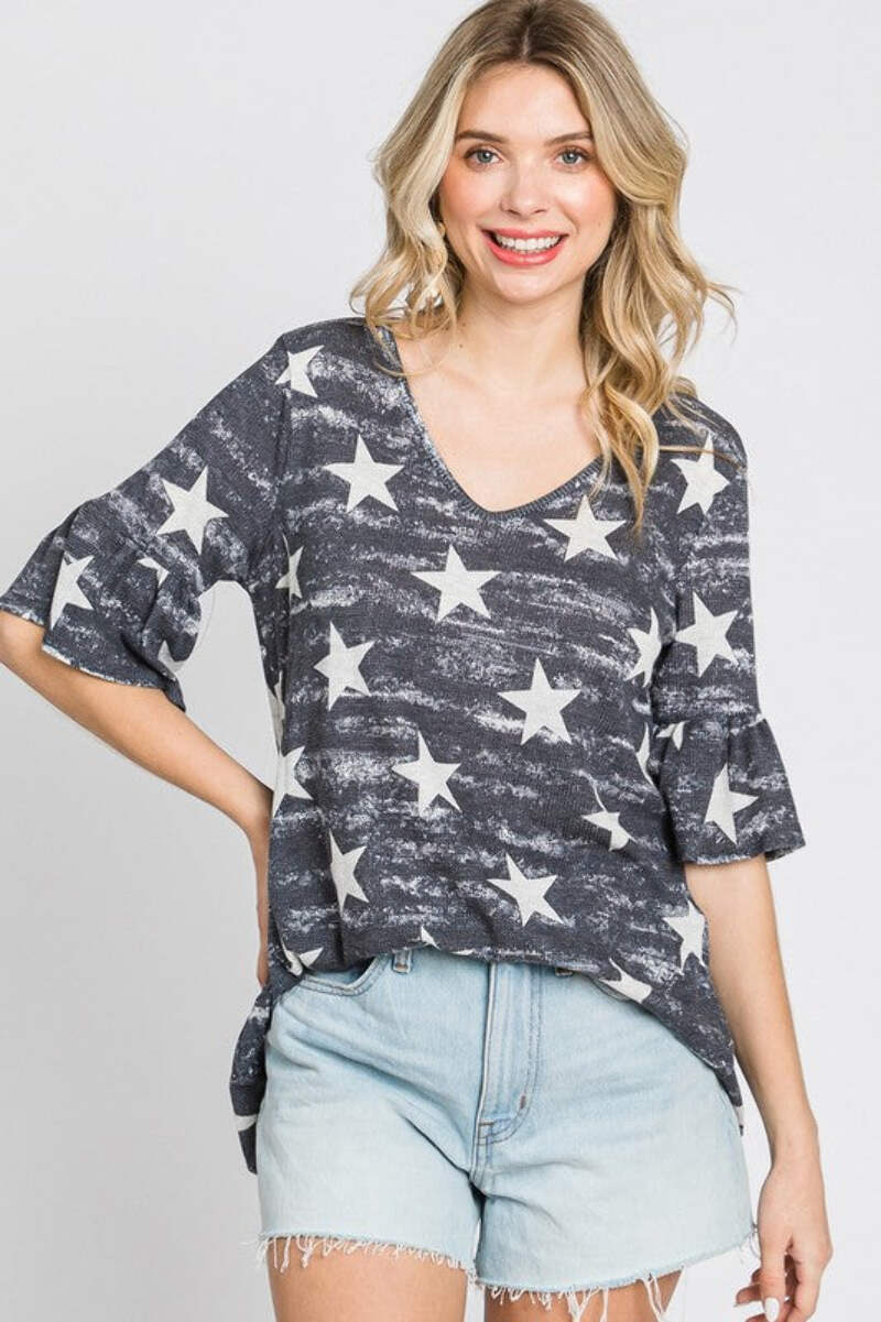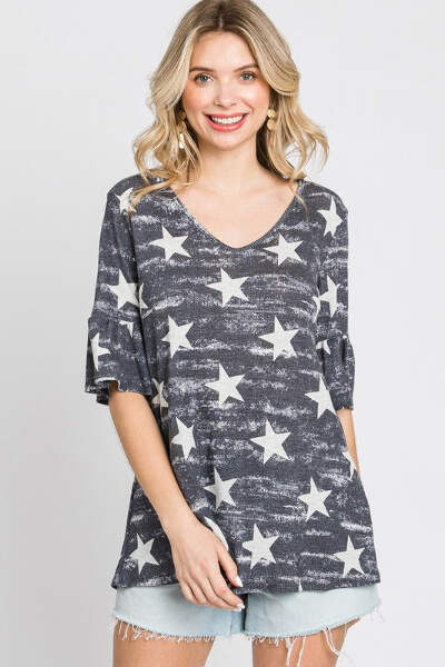 Make a statement with our Vintage Star Print V-Neck Top, a testament to timeless style with a modern twist. Designed and made in the USA, this top is a standout piece featuring a classic star motif on a thermal backdrop, ensuring you shine in any setting. Its lightweight composition makes it a staple for all-day wear, while the ruffled bell sleeves add a touch of playful sophistication to your look.
