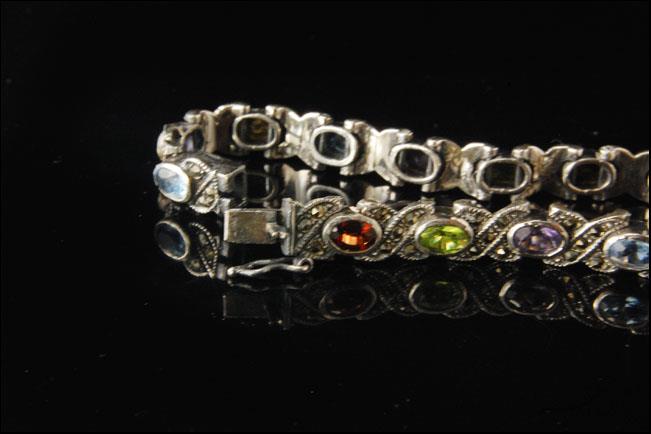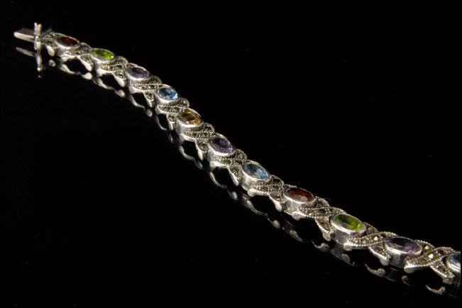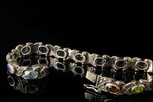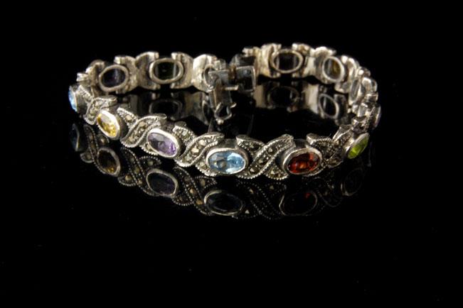 This is a very beautiful, unique and old CITRINE TOPAZ GARNET AMETETHYST 925 STERLING c. 1930 bracelet (weight 19.7g). The bracelet has a delightful marcasite decoration, Art Deco style with citrine, garnet, amethyst, topaz, peridot and sterling 925. It measures 7" long. The bracelet has a very extravagant feel to it and is in very good condition.