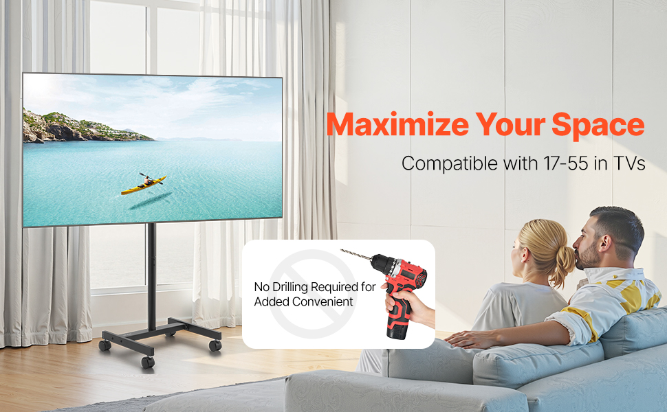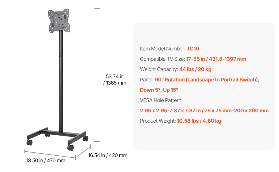 Compatibilità universale: Questo supporto TV con ruote è progettato per TV LED, LCD e OLED piatte e curve da 17-55 pollici (431,8-1397 mm) e supporta schemi di montaggio VESA da 2,95 x 2,95 a 7,87 x 7,87 pollici (da 75 x 75 mm a 200 x 200 mm)