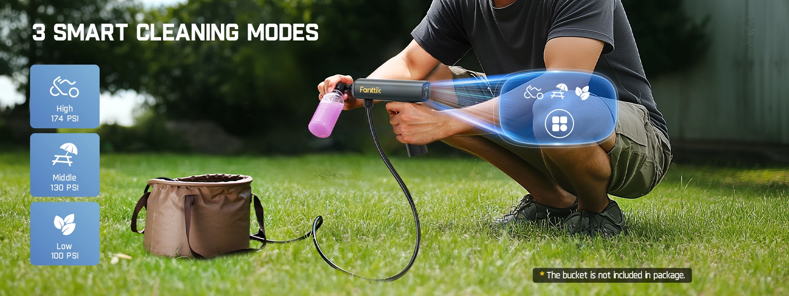 The Fanttik K100 Flip Portable Cordless Electric Sprayer is a lightweight, foldable, and highly efficient portable washer. Designed for ultimate convenience, this tool is perfect for outdoor enthusiasts, travelers, and homeowners who need a compact solution for cleaning tasks. With three pressure modes and a 5-in-1 nozzle, this sprayer is versatile enough for various applications, from washing vehicles to cleaning outdoor gear or camping equipment. Equipped with Type-C charging and a portable design, the K100 makes on-the-go cleaning hassle-free. Just run the included hose from the K100 to a clean bucket of water for use anywhere! Not for use with garden hoses, faucets, or other direct water sources.