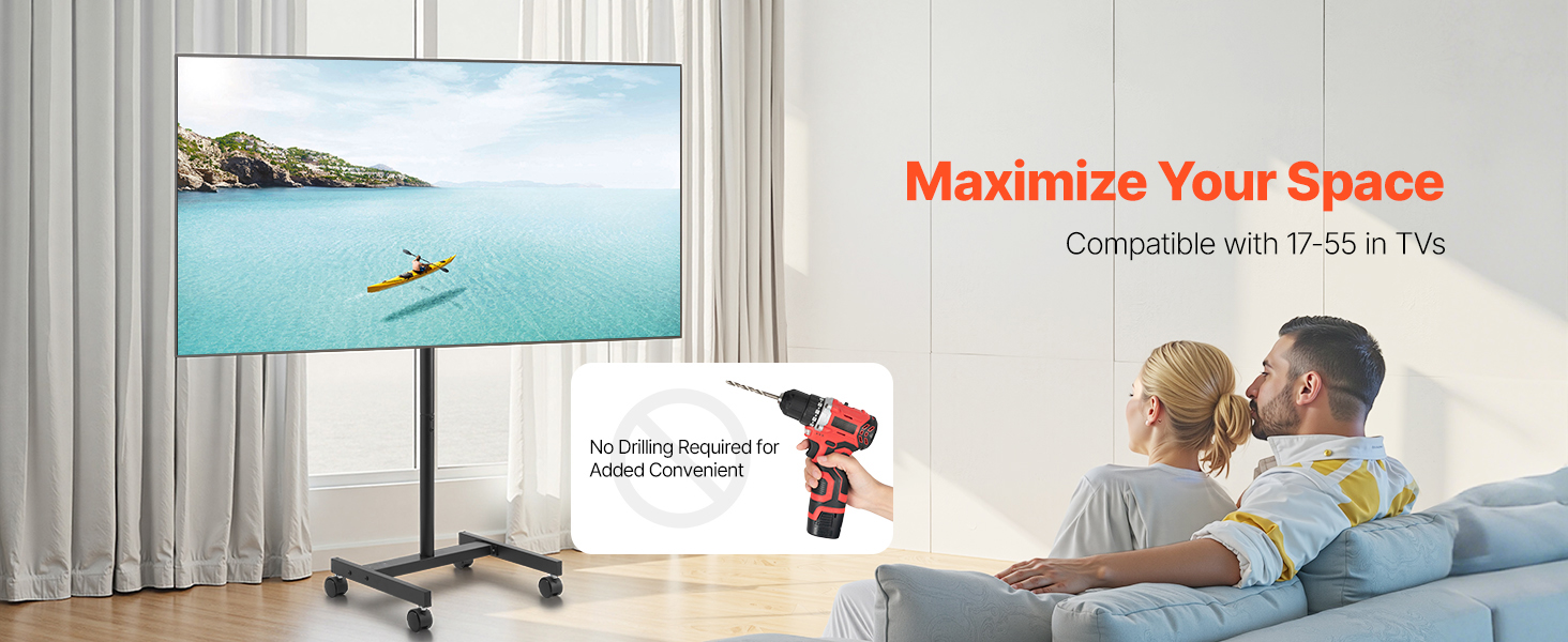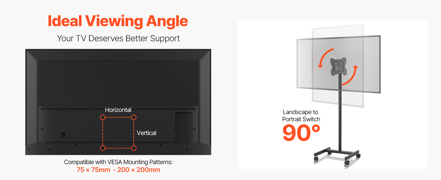 Compatibilità universale: questo supporto TV con ruote è progettato per TV LED, LCD e OLED piatte e curve da 17-55 pollici (431,8-1397 mm) e supporta schemi di montaggio VESA da 2,95 x 2,95 a 7,87 x 7,87 pollici (da 75 x 75 mm a 200 x 200 mm)